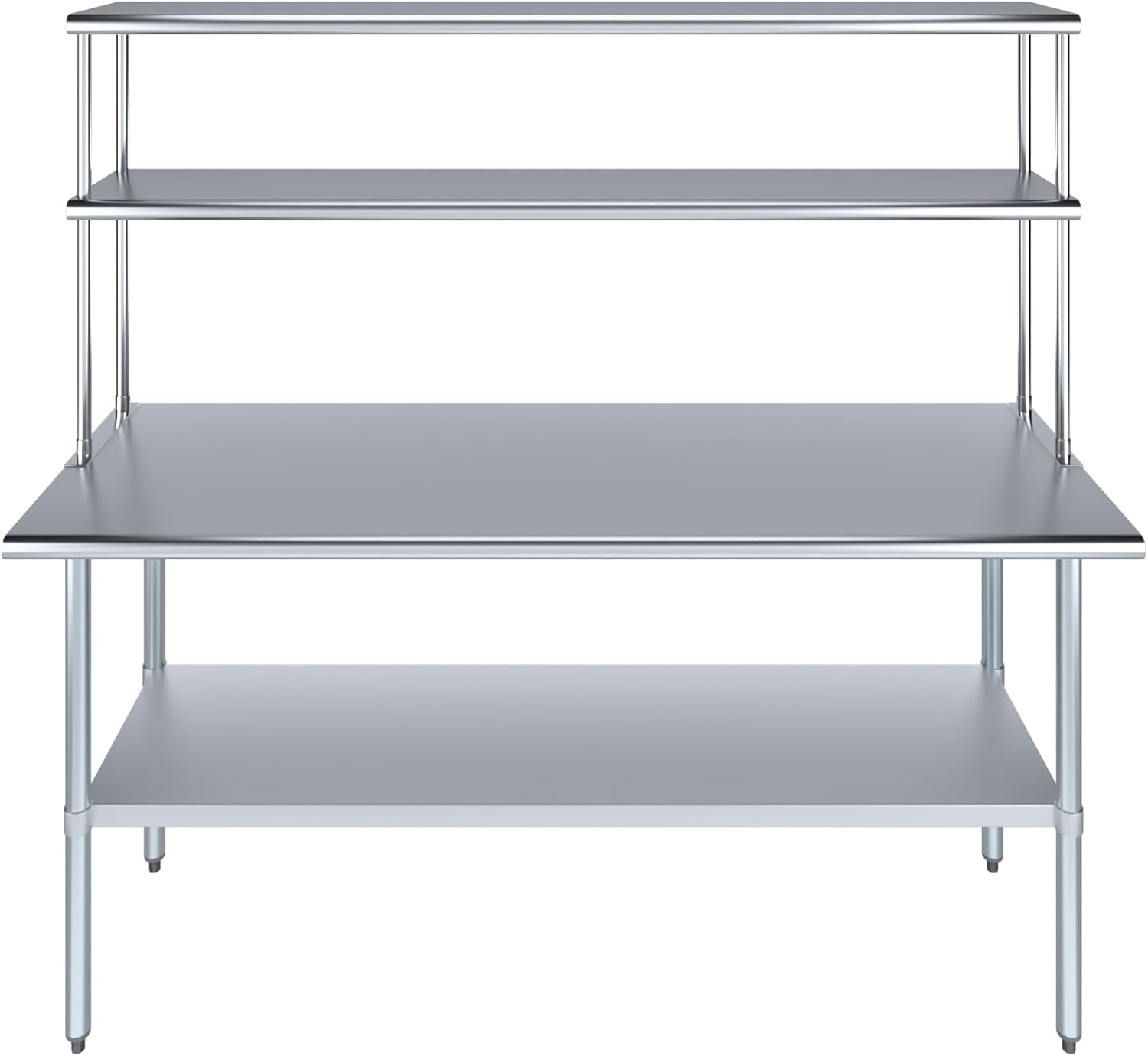 - WORK SAFETY: Work table top and double tier adjustable shelves are constructed from 18-gauge stainless steel, making this restaurant prep and serve table and double tier shelf combo set is durable and long lasting. The table top comes with a galvanized under-shelf for additional storage and adjustable legs for convenience. This table and shelf set is specifically designed and finished for use in a commercial or industrial setting, but is just as reliable in the home.