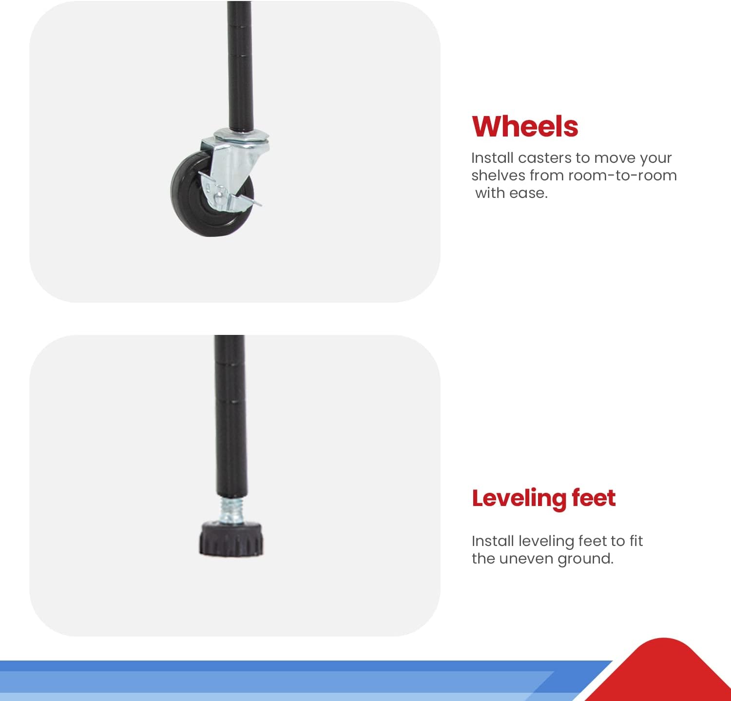 - Locked Wheels:The casters are very sturdy and high-quality, easy to move. The wheels of the shelf are equipped with fixed locks, which can be fixed or moved at any time. For example, when you need to push a metal storage rack into a kitchen, garage, or office, etc., you can unlock it. If you want to fix the heavy metal shelf in place, you can lock it.