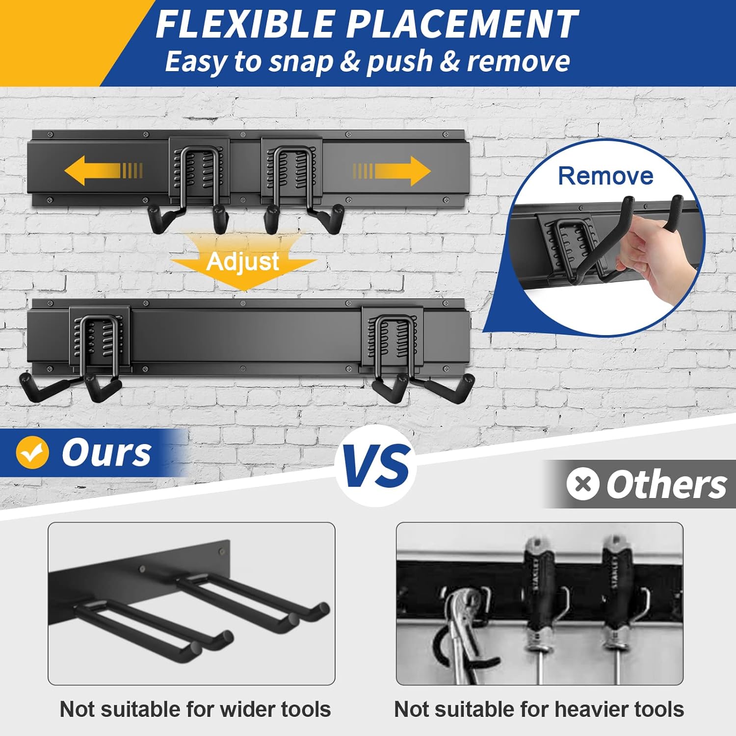 - Easy installation: Our Garage Tool Organizer comes with straightforward installation instructions, allowing you to set it up effortlessly in minutes. Within no time, you'll have an organized and functional tool wall. Garage hooks can be easily repositioned anywhere on the tracks of the panel when storage needs change.