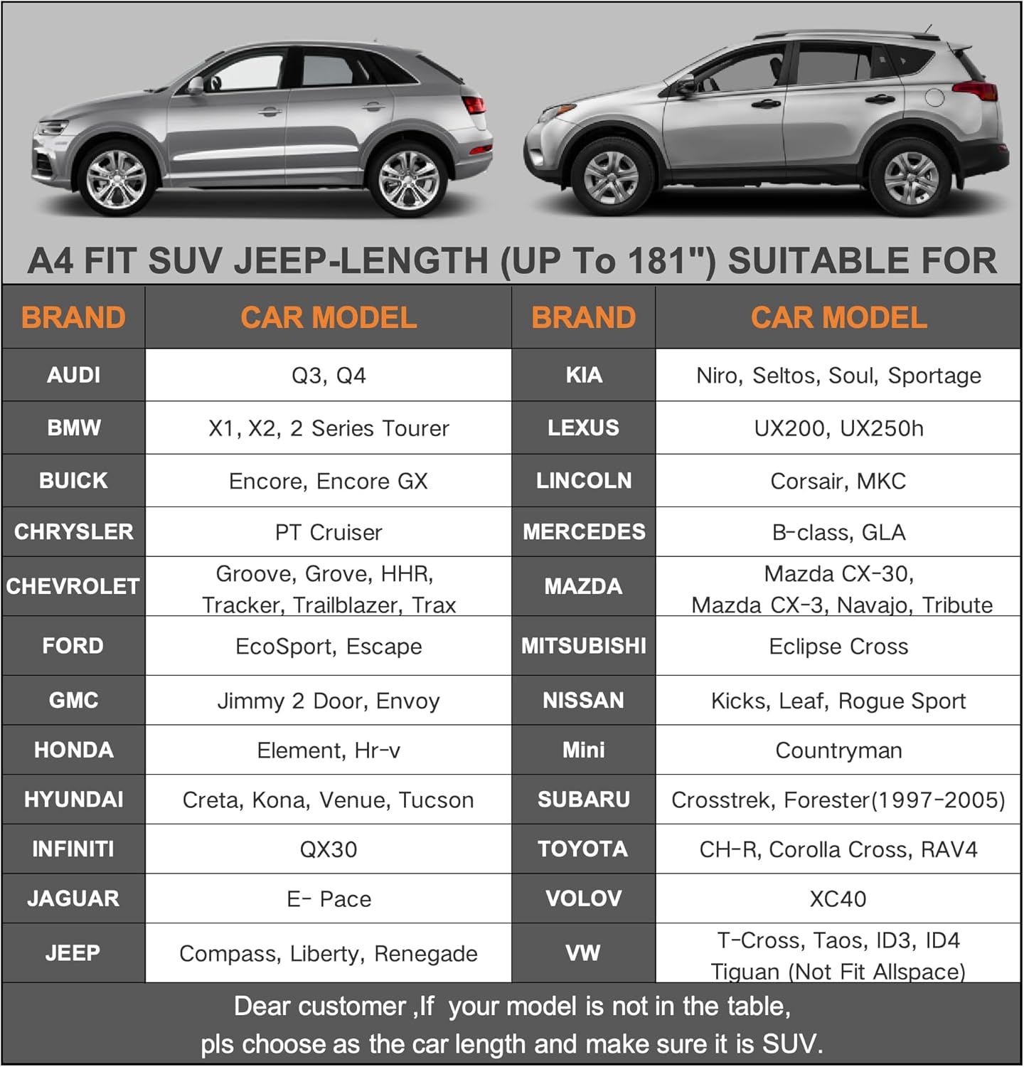 - ăDimension A4ăâ Universal fit for Suv Jeep which length is up to 181 inch (NOT FOR SEDAN AND HATCHBACK). Suitable for Audi q3, BMW X1, Honda hrv, Hyundai Tucson/Kona, Volvo XC40, Buick Encore, Jeep compass/liberty/renegade, Kia Soul/Sportage, Subaru forester/xv etc.