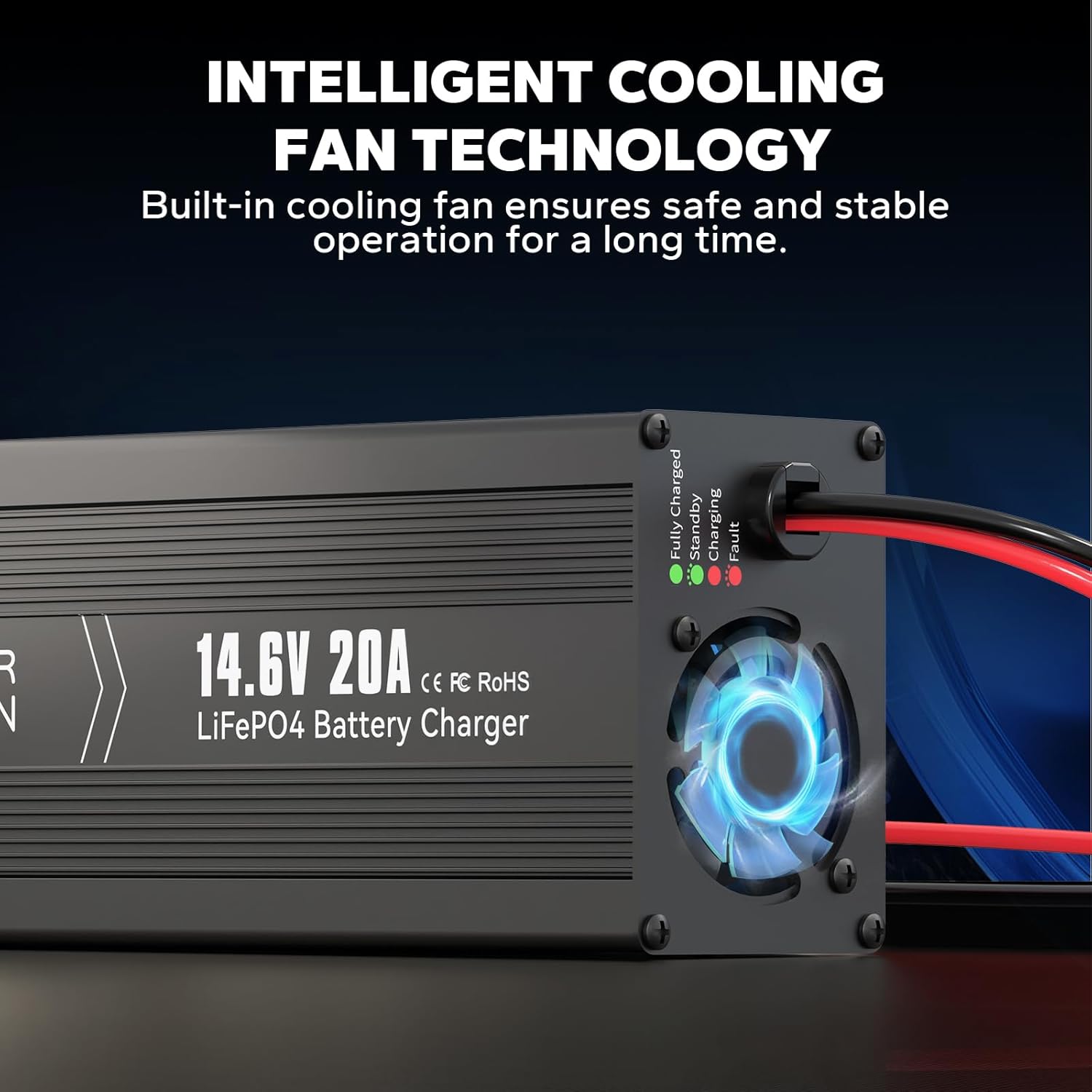 - 【HIGH-EFFICIENCY CHARGING】With a constant current of 20A and a constant voltage around 14.6V, it’s Ideal for LiFePO4 batteries 20 amp hours and above. Only needs 5 hours of fast charging time to fully charge a 12V 100Ah LiFePO4 battery compared with 3 amps multi-charger which needs 33 hours to fully charge a 100Ah battery.