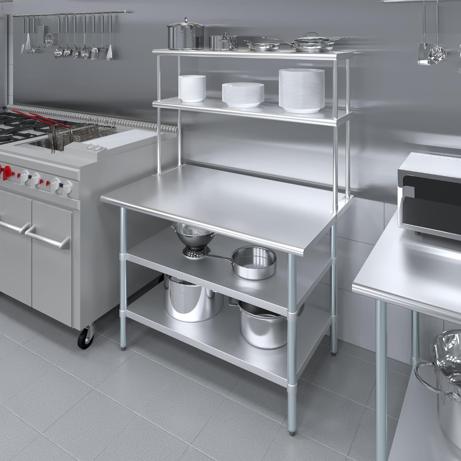 - WORK SAFETY: Work table top and double tier adjustable shelves are constructed from 18-gauge stainless steel, making this restaurant prep and serve table and double tier shelf combo set is durable and long lasting. The table top comes with a galvanized under-shelf for additional storage and adjustable legs for convenience. This table and shelf set is specifically designed and finished for use in a commercial or industrial setting, but is just as reliable in the home.