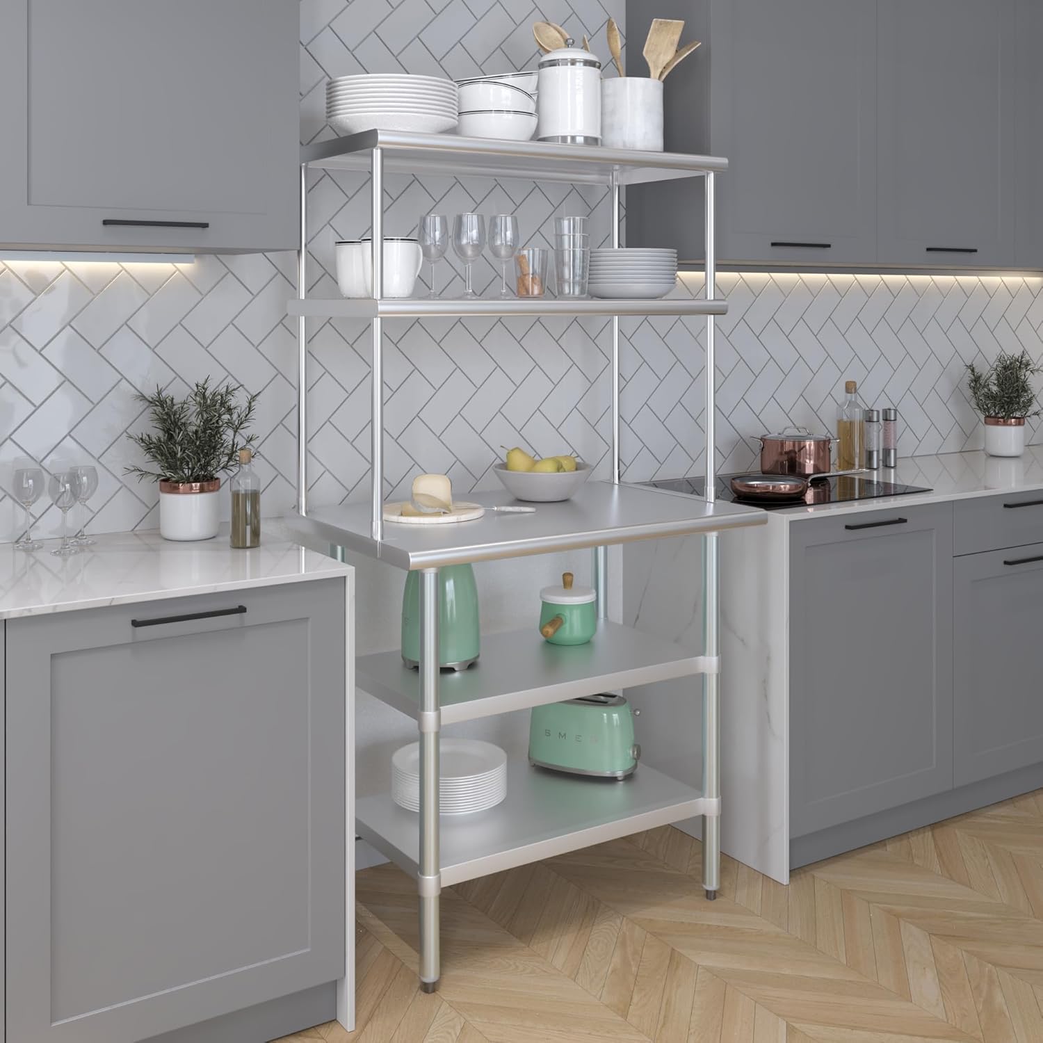 - WORK SAFETY: Work table top and double tier adjustable shelves are constructed from 18-gauge stainless steel, making this restaurant prep and serve table and double tier shelf combo set is durable and long lasting. The table top comes with a galvanized under-shelf for additional storage and adjustable legs for convenience. This table and shelf set is specifically designed and finished for use in a commercial or industrial setting, but is just as reliable in the home.