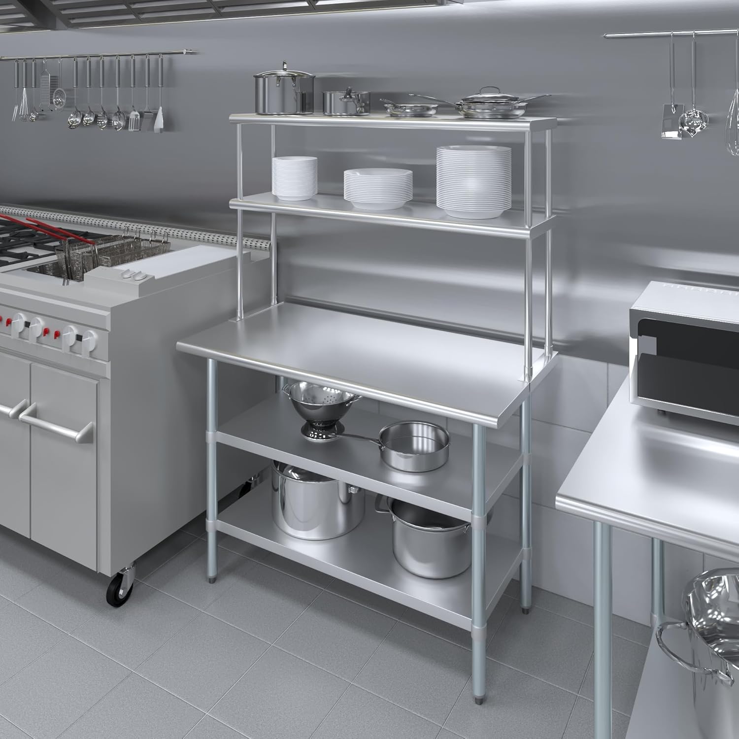 - WORK SAFETY: Work table top and double tier adjustable shelves are constructed from 18-gauge stainless steel, making this restaurant prep and serve table and double tier shelf combo set is durable and long lasting. The table top comes with a galvanized under-shelf for additional storage and adjustable legs for convenience. This table and shelf set is specifically designed and finished for use in a commercial or industrial setting, but is just as reliable in the home.