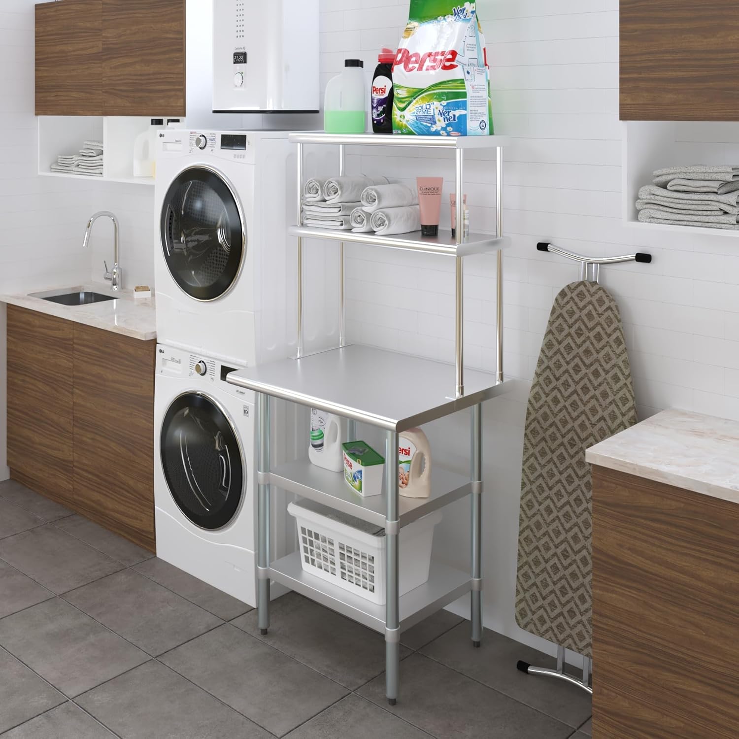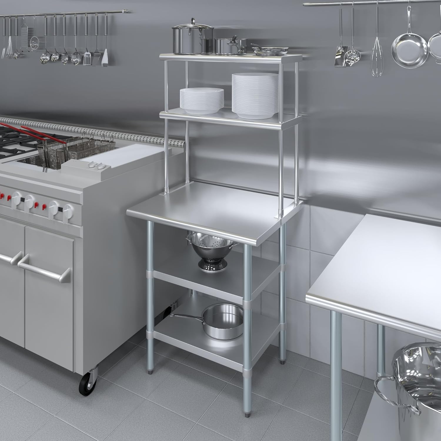 - WORK SAFETY: Work table top and double tier adjustable shelves are constructed from 18-gauge stainless steel, making this restaurant prep and serve table and double tier shelf combo set is durable and long lasting. The table top comes with a galvanized under-shelf for additional storage and adjustable legs for convenience. This table and shelf set is specifically designed and finished for use in a commercial or industrial setting, but is just as reliable in the home.