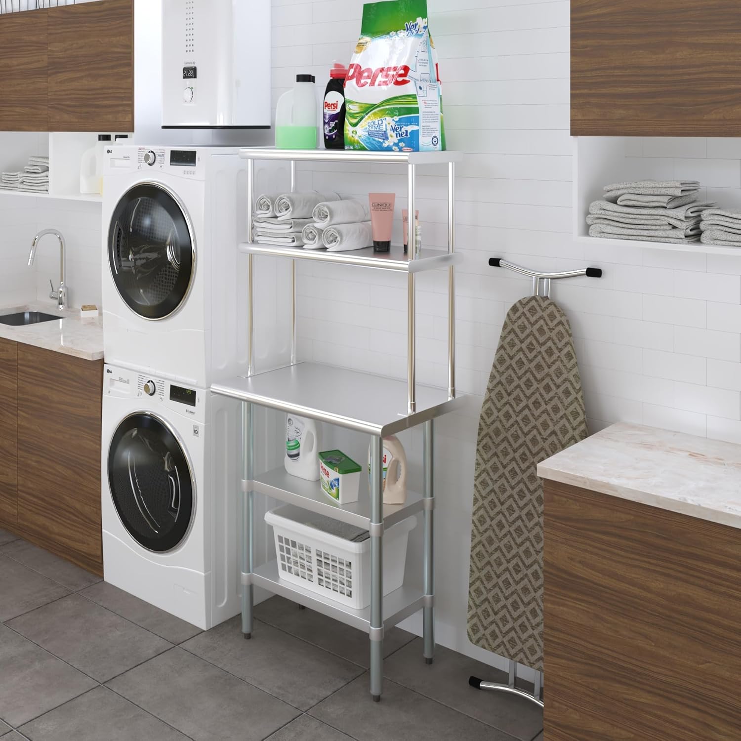 - WORK SAFETY: Work table top and double tier adjustable shelves are constructed from 18-gauge stainless steel, making this restaurant prep and serve table and double tier shelf combo set is durable and long lasting. The table top comes with a galvanized under-shelf for additional storage and adjustable legs for convenience. This table and shelf set is specifically designed and finished for use in a commercial or industrial setting, but is just as reliable in the home.