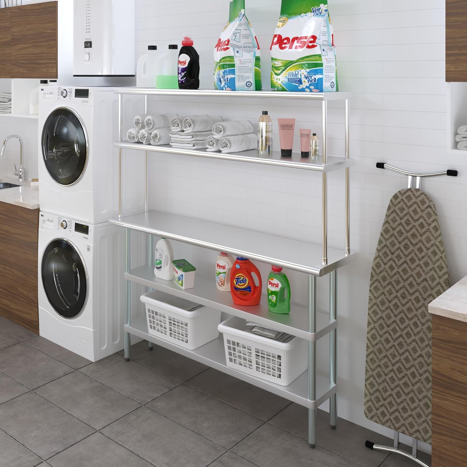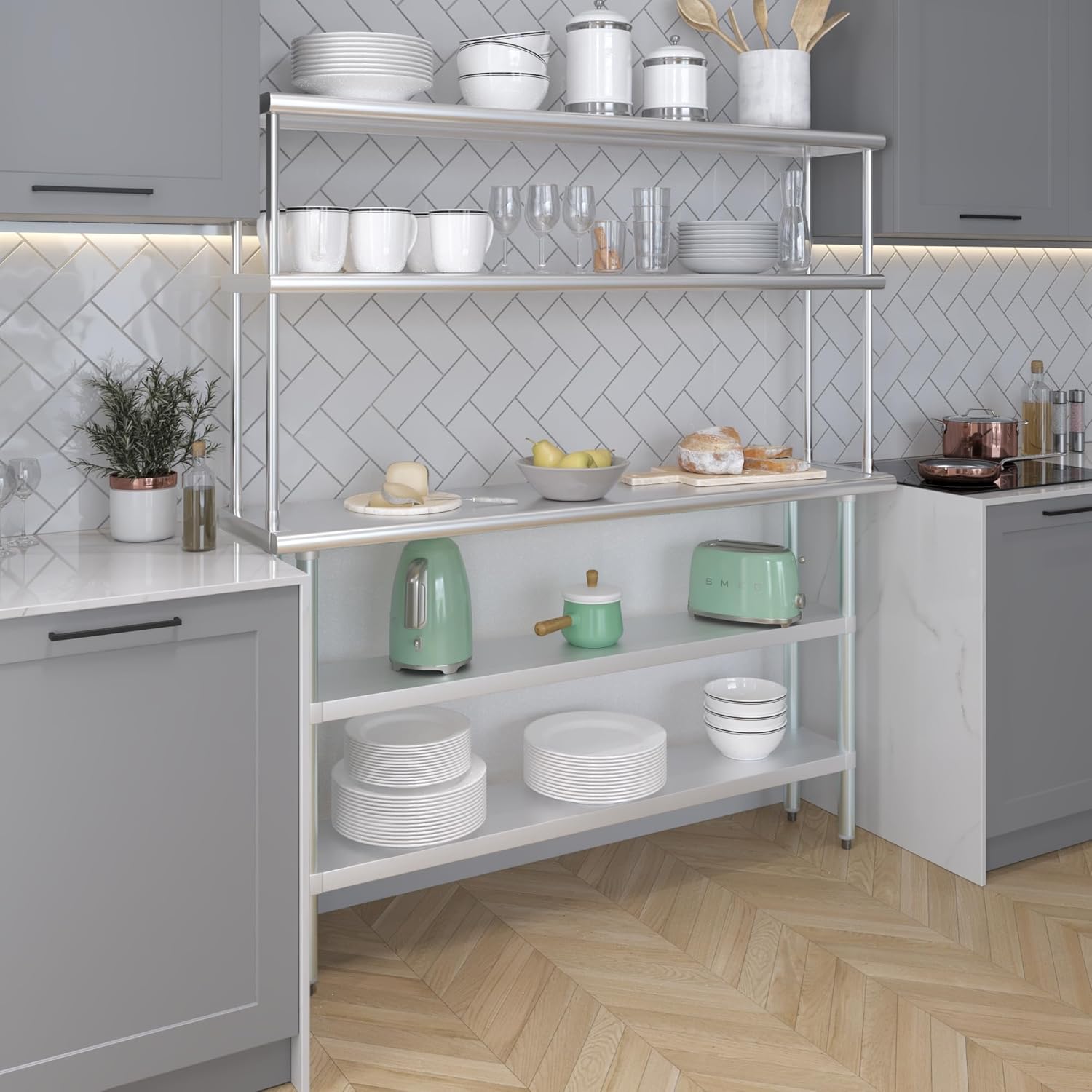 - WORK SAFETY: Work table top and double tier adjustable shelves are constructed from 18-gauge stainless steel, making this restaurant prep and serve table and double tier shelf combo set is durable and long lasting. The table top comes with a galvanized under-shelf for additional storage and adjustable legs for convenience. This table and shelf set is specifically designed and finished for use in a commercial or industrial setting, but is just as reliable in the home.