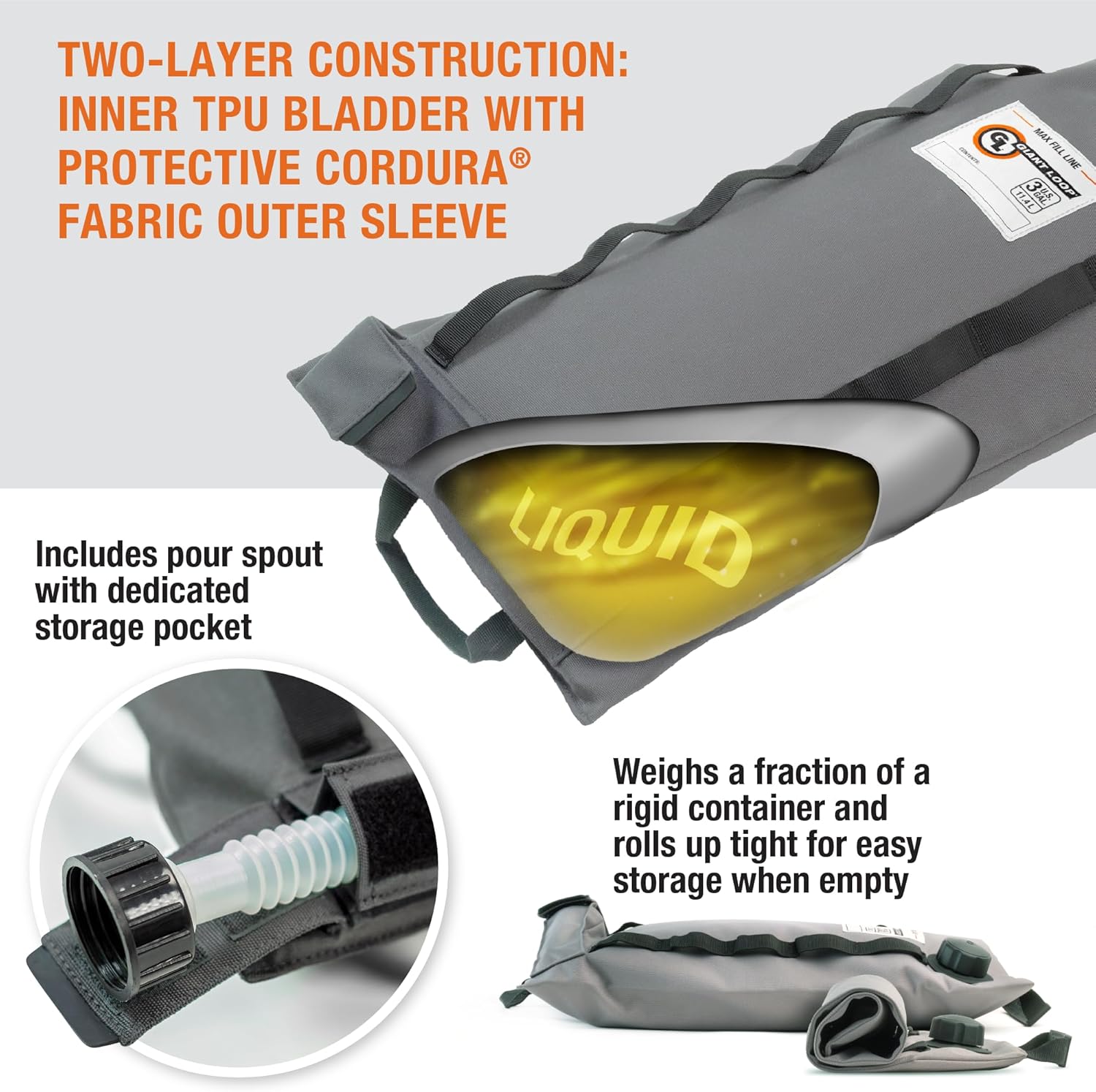 - DURABLE MATERIAL: Employs a two-layer construction, including an RF-welded inner bladder that?s protected by a highly abrasion resistant sewn Cordura outer sleeve. The bag also features webbing and rubber-molded handles that make filling and installing the pour spout and dispensing liquids easier.