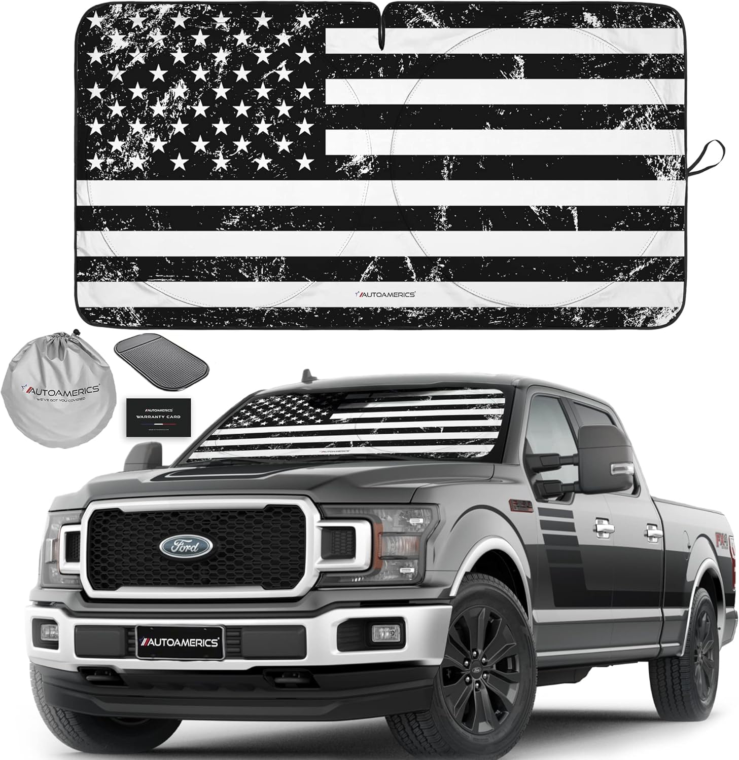 Autoamerics Truck Windshield Sun Shade with Storage Pouch & Anti-Slip Dash Pad - Foldable Grunge B&W USA Flag Design - Fits Most SUVs & Trucks - Reflective 230T Material | X-Large (66 x 36 inches)