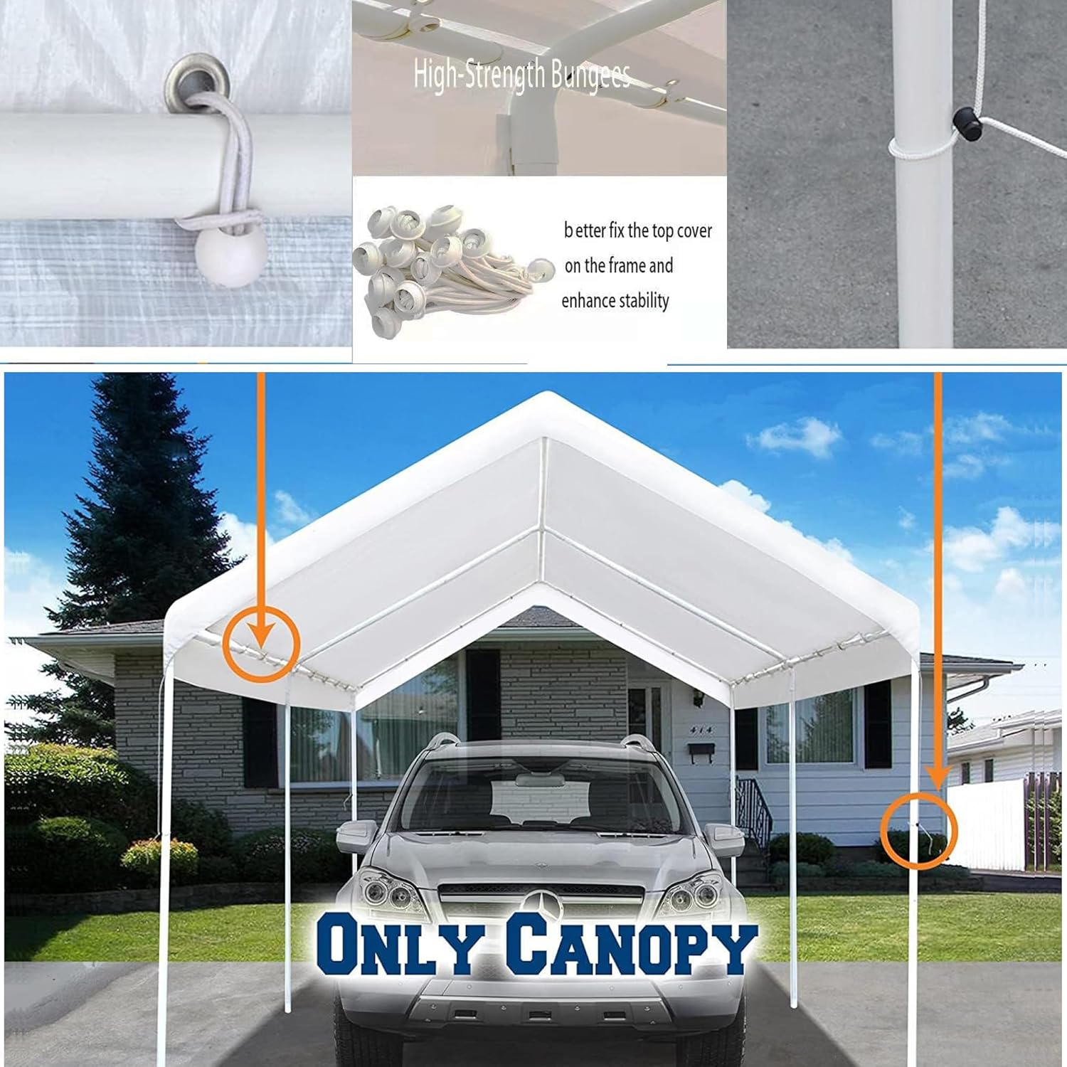 - [Easy to Install] Installation setup is super quick and easy. 40 Bungee cords are inlcuded to tightly secure the canopy to the frame. This will enhance the stability of the carport. Meanwhile The Carport Replacement Canopy Has grommet holes for tie down. UV resistant carport canopy
