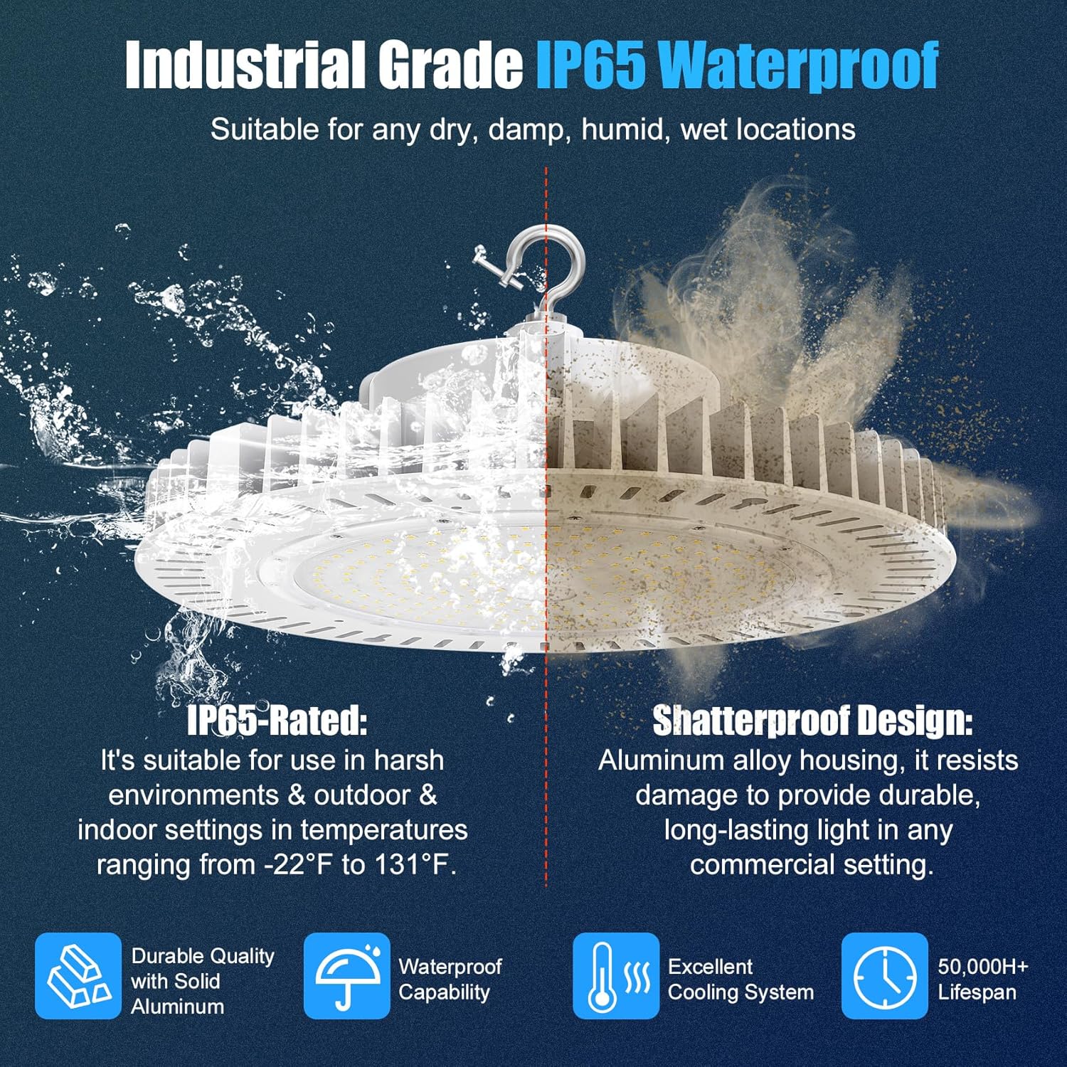 - 【Widely used applications】LED high bay lights is easily installed to the ceiling with built in hook, and comes with a safety ropes to provide double protection, allowing easy direct access to 120V AC power sourcing. It is widely used in warehouses, shops, exhibition halls, stadiums, gas stations, factories, highway toll stations, supermarkets and large commercial establishments.