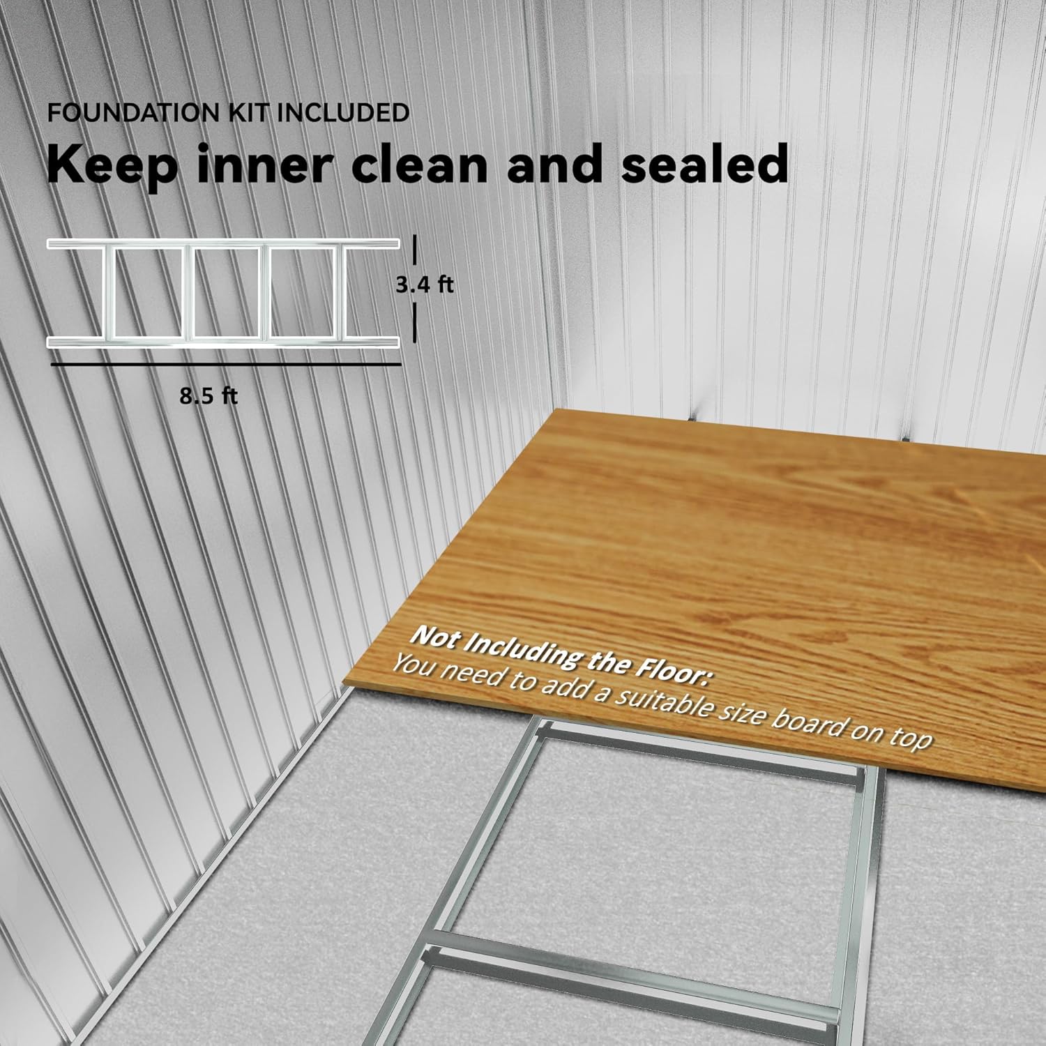 • Weather Ready: This metal shed has a water-safe galvanized steel frame, which makes it great for year-round outdoor use. It also has a foundation kit, which enhances stability by itself or keeps the space clean and sealed as a floor with the help of some wood boards.