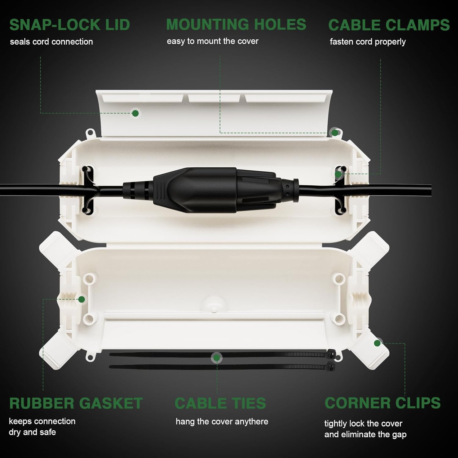 - With the 4 corner clips, snap-lock lid, and rubber gaskets, this outdoor extension cord cover box is IP44 waterproof. Perfect to seal 14/16/18 gauge cord, braided cable and flat wire.