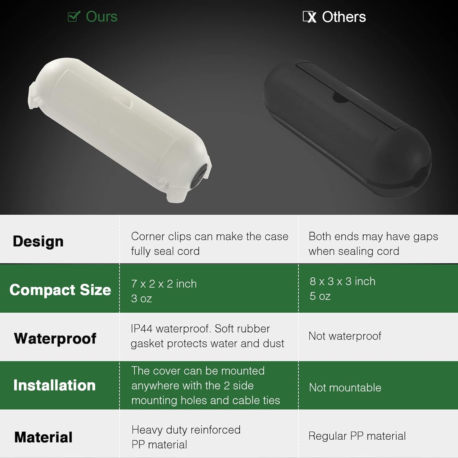 - Designed to keep cord connection secure and protected. Compact size and light weight are great to protect outlet/plug/socket/connection hanging in the air.