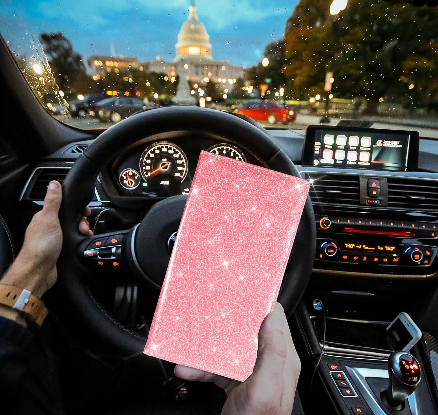 TOURSUIT Car Registration and Insurance Card Holder, Vehicle License Document Glove Box Compartment Organizer, Interior Car Accessories for Women Men Teens (Glitter Pink)