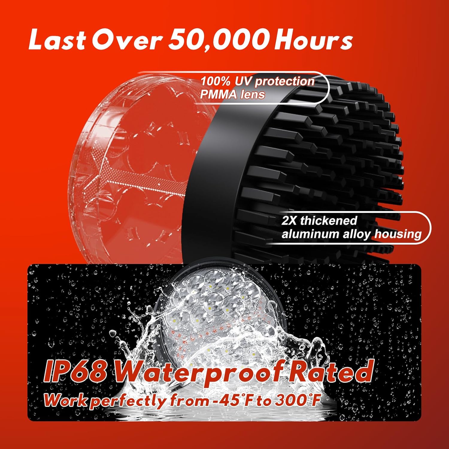 - ăLast Over 50,000 Hoursă 100% UV protection PMMA, 2X thickened aluminum alloy housing, IP68 waterproof rated, work perfectly from -45°F to 300°F. We engineer to the highest quality for maximum brightness and endurance to withstand even the toughest conditions