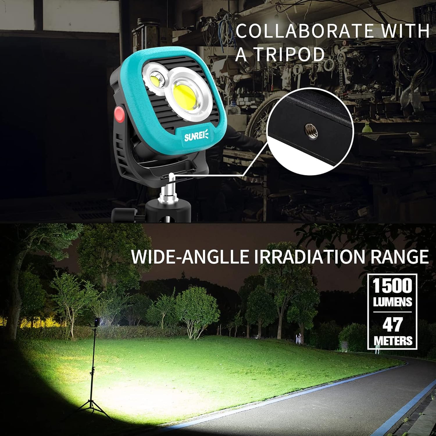 - [6 Modes/4 color temperatures/17 choices ]: Battery powered work lights with COB panel, combination of brightness (Low/medium/high/maximum), color temperature (6500K/4500K/3500K/2500K) and red mode. It can shine as far as 154 feet away。Each level of brightness can be adjusted to four different color temperaturesThe modes of this automotive work light are 4 × 4 + 1 = 17 (1500LM-120LM).led beads can send out red light and SOS mode, and can be used as warning light in emergency lights.ic Lights 180° Rotating Garage,1500LM & 5 Modes IPX5 Waterproof ,Bright Floodlights Car Repairing Fishing(gray)