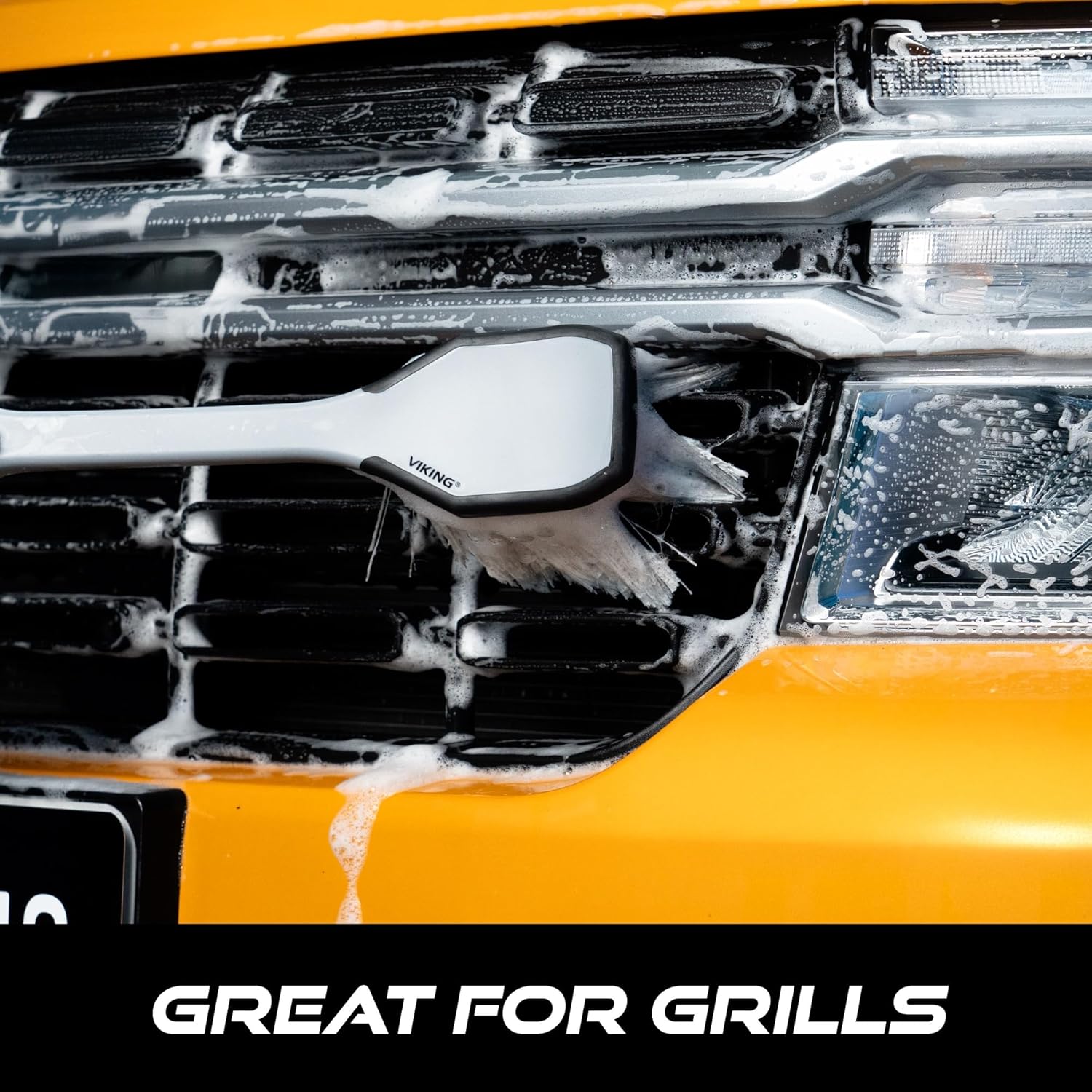 - Car Wash Brush measuring 16.5 inches long with a patented, ergonomic design for cleaning grills, fenders, fender flares, bumpers, and wheel wells