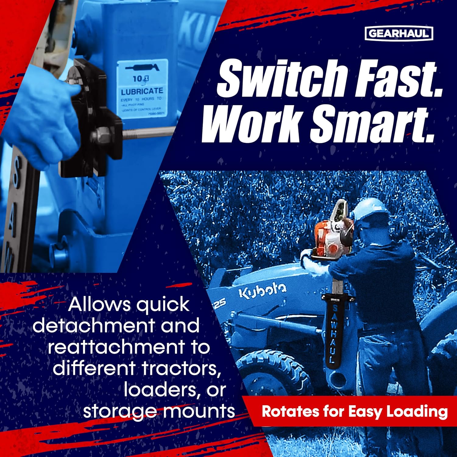 - EASY TRANSFER BETWEEN DIFFERENT EQUIPMENT. GearHaul’s Snap-Lok Rotating Chainsaw Mount for Tractors allows quick detachment and reattachment to different mobile machinery equipped with Snap-Lok Base mounts. The rotating feature provides effortless access to your chainsaw, reducing strain and improving workflow efficiency.