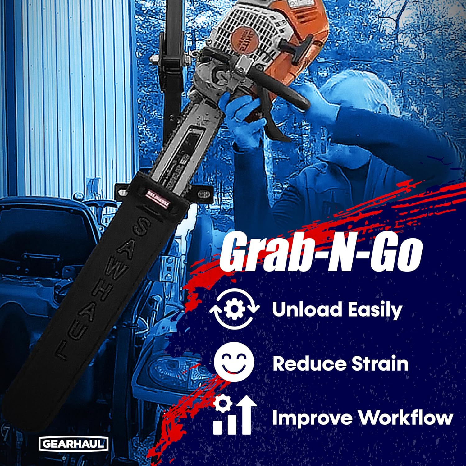 - GRAB-N-GO. Designed for quick retrieval, the SawHaul Snap-Lok Rotating chainsaw mounting bracket makes it ideal for professionals who need instant access to their chainsaw while working.