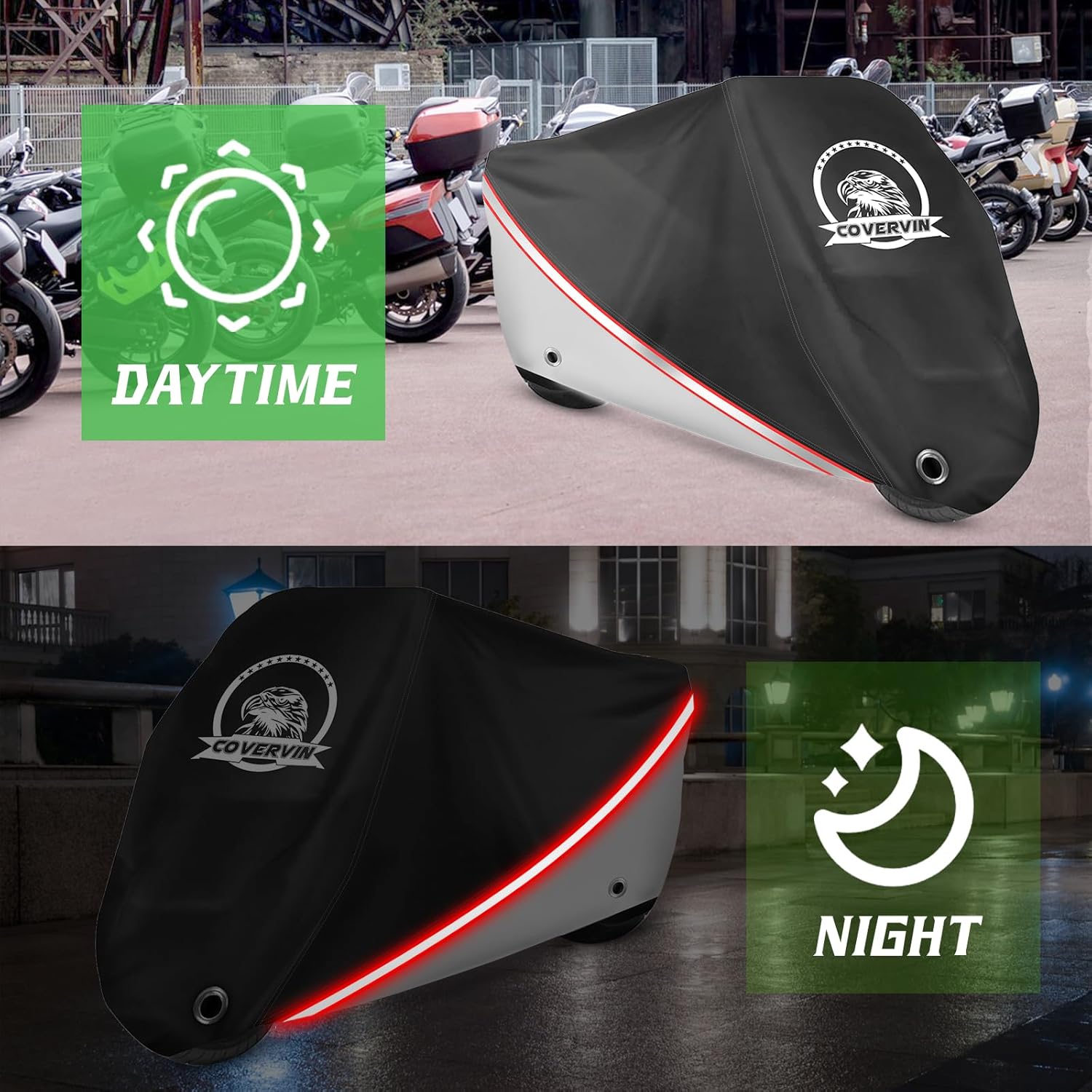 COVERVIN Motorcycle Cover, All Weather Outdoor Waterproof Night Protection with Reflective Strips, Locking Holes and Storage Bag for 116 Inch Suzuki, Kawasaki, Honda, Harley-Davidson(Silver XXXL)