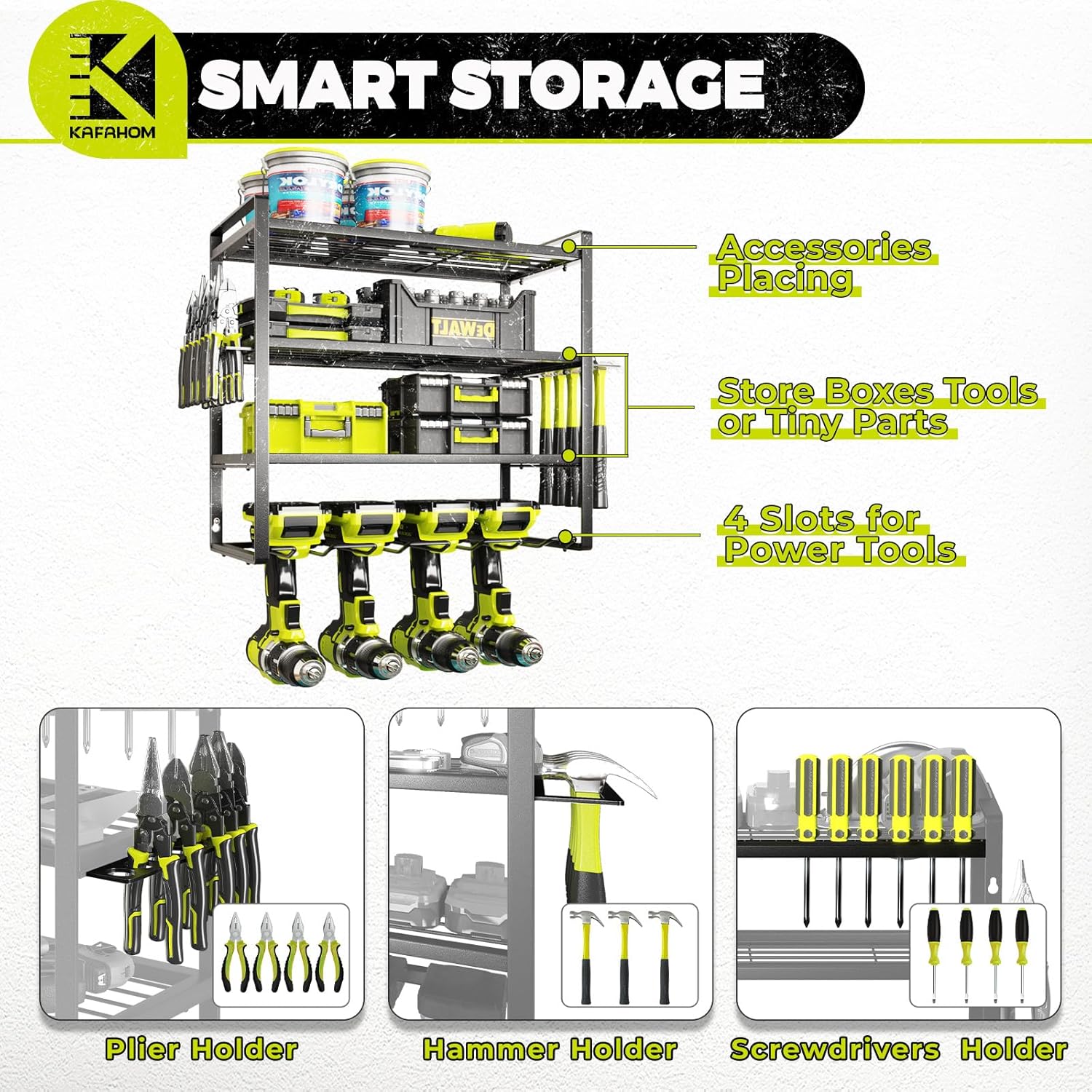 KAFAHOM Power Tool Organizer, Garage Tool Organizers and Storage,Drill Holder Wall Mount, Storage Rack for Cordless Drill, Heavy Duty Tool shelf with Screwdriver Holder/Pliers Holder/Hammer Holder