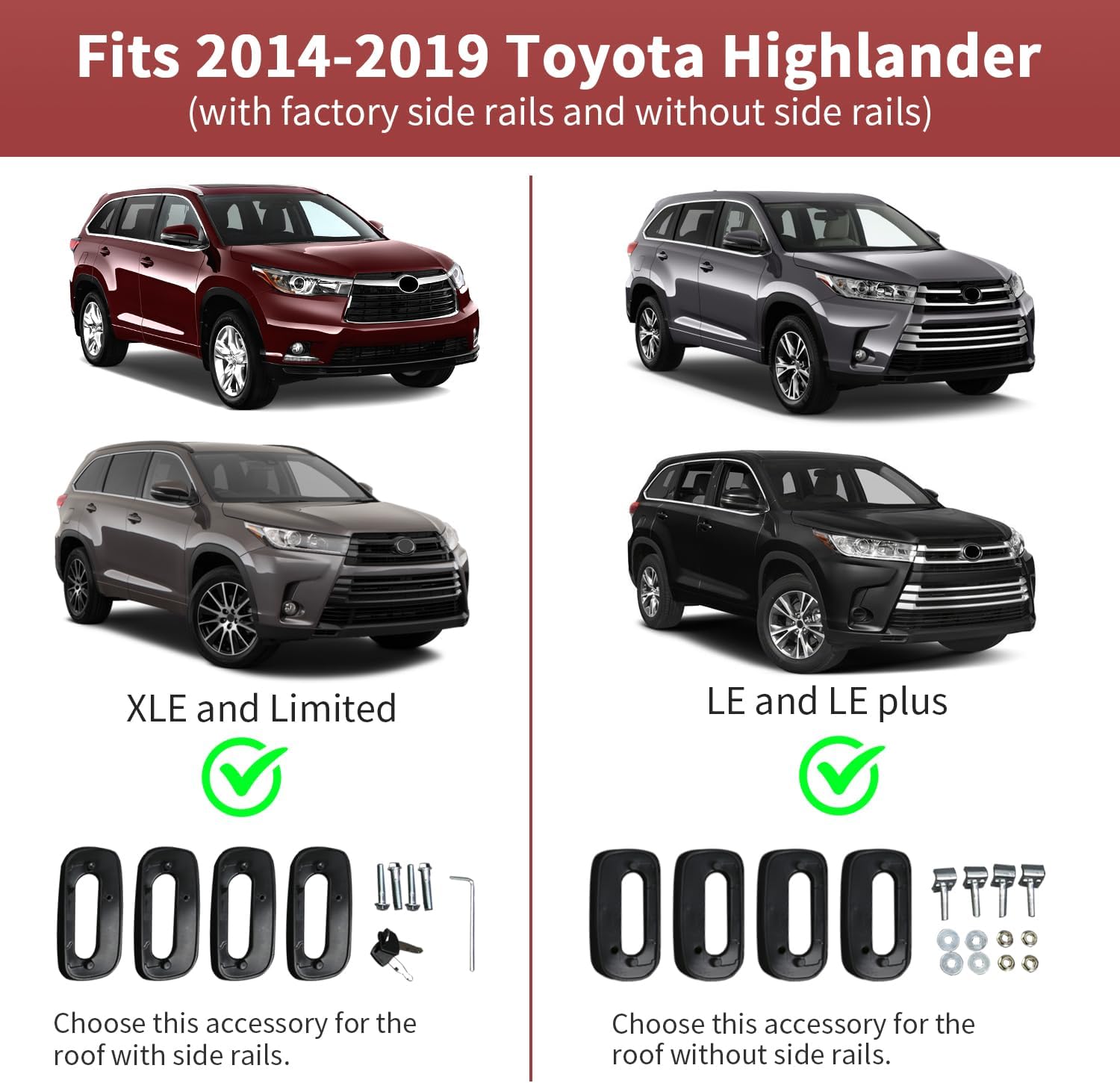 - ăExcellent fităThese roof rack crossbars are specifically replacements for Toyota Highlander 2014-2019 (with actual side rails and without side rails). There are two packages of accessories in each set. One for XLE, Limited and Limited Platinum models. Other fit for LE and LE Plus models.Please make sure it fits your vehicle before purchasing.