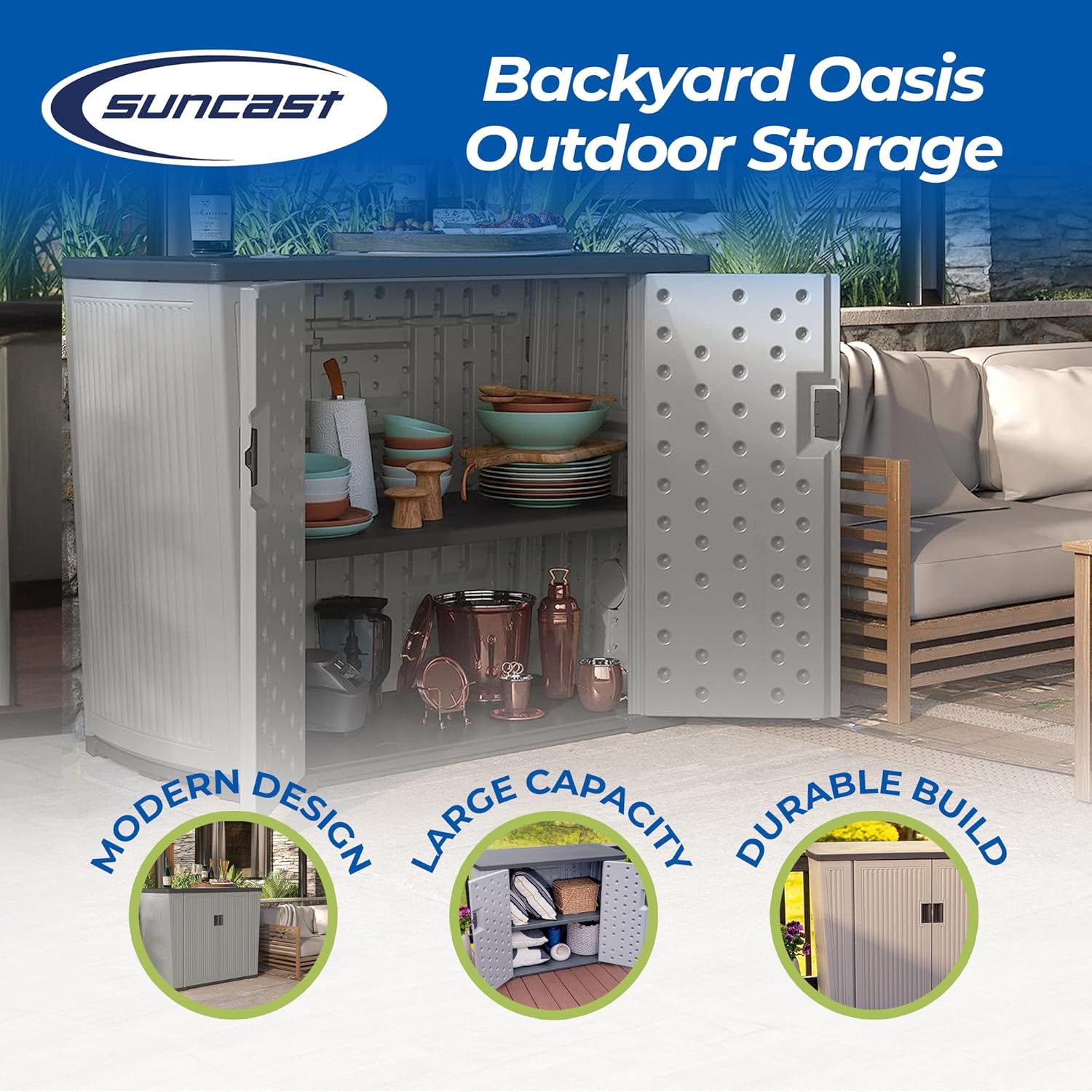 Suncast Outdoor Storage Shed for Patio and Garden, Backyard Oasis, 130 Gallon, Dove Gray