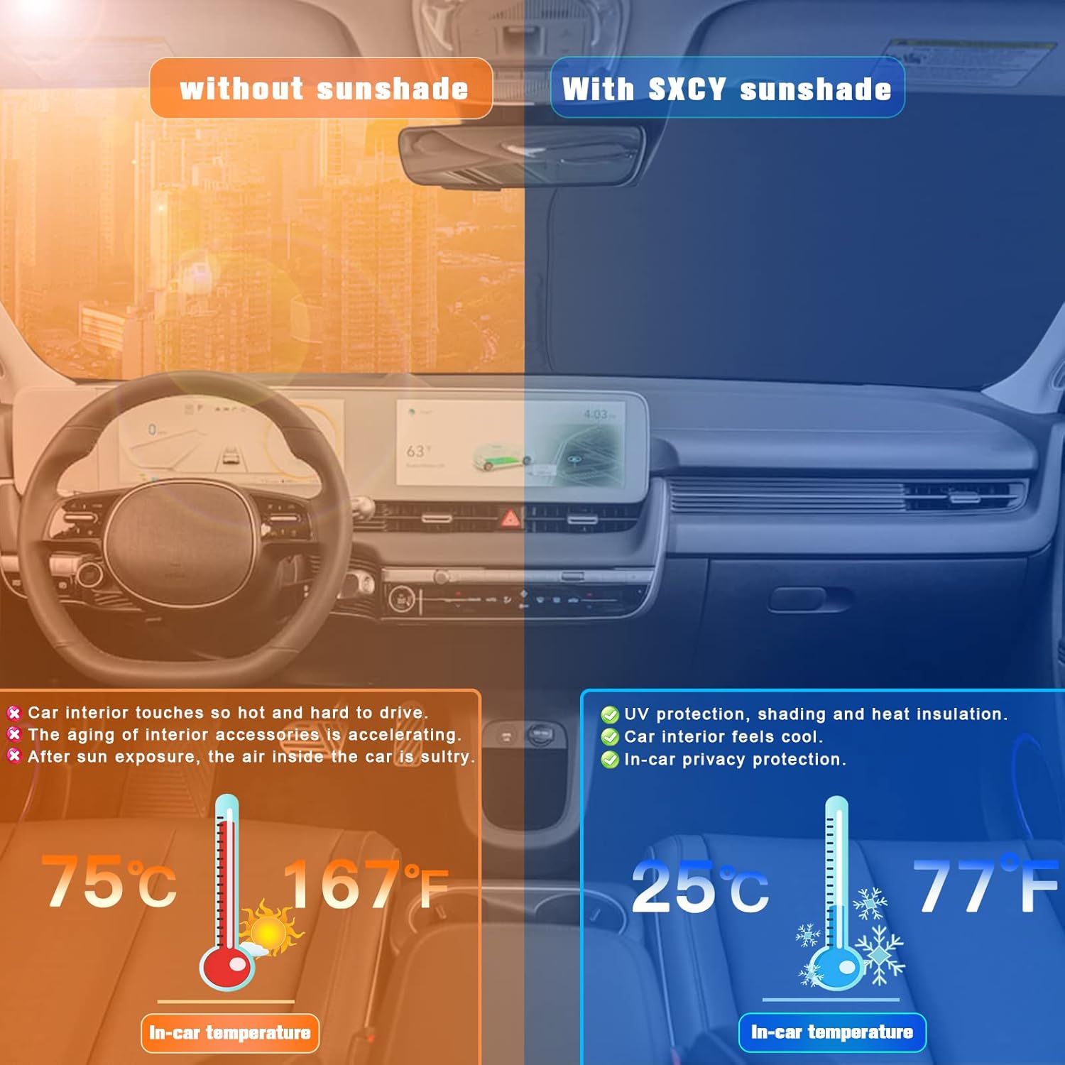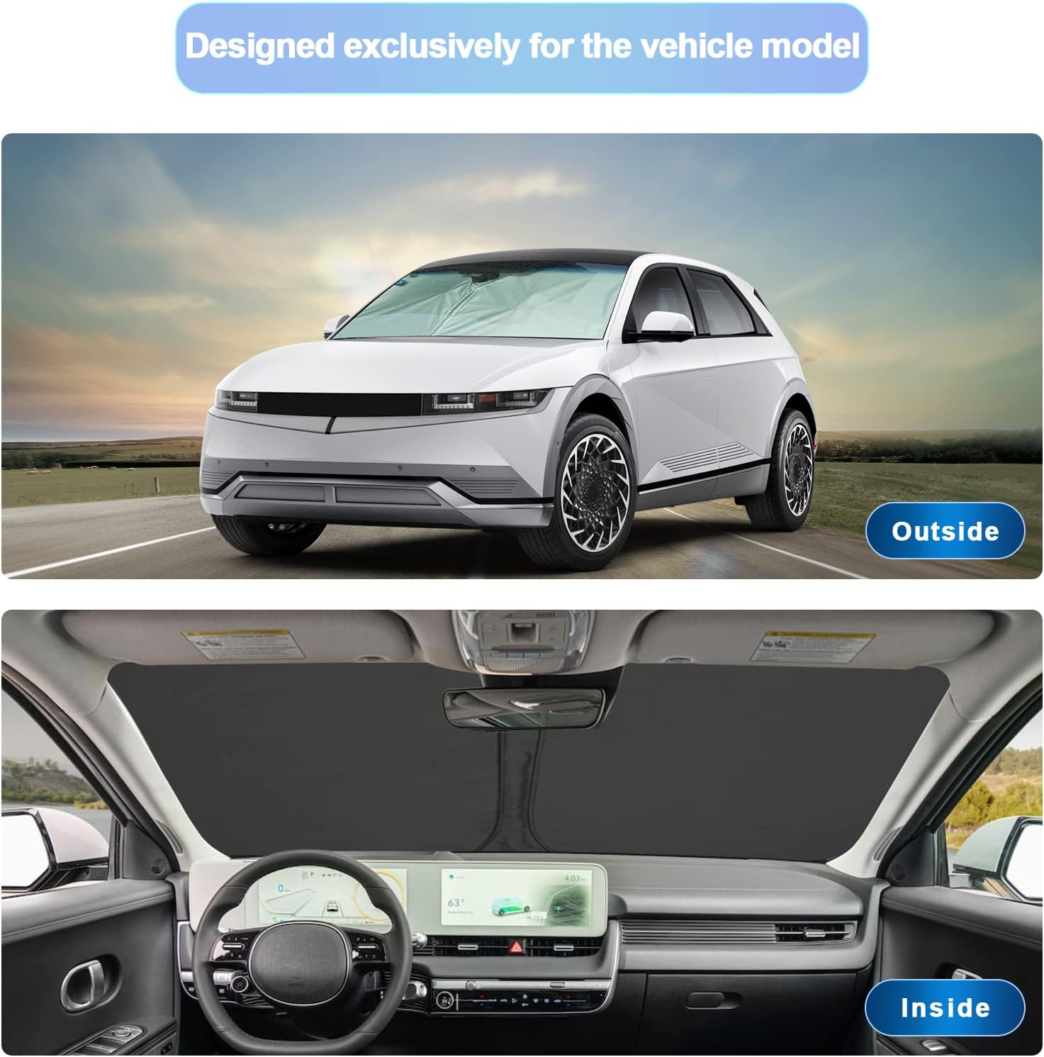 - 1.Custom Fit: this windshield sun shade is custom designed for 2022 2023 2024 2025 hyundai ioniq 5 sunshade for 2022 2023 2024 2025 hyundai ioniq 5 accessories front window.You don’t need to worry about oversize or too small,consider it if you need a car protector cover that protects your car interior from sunburn.