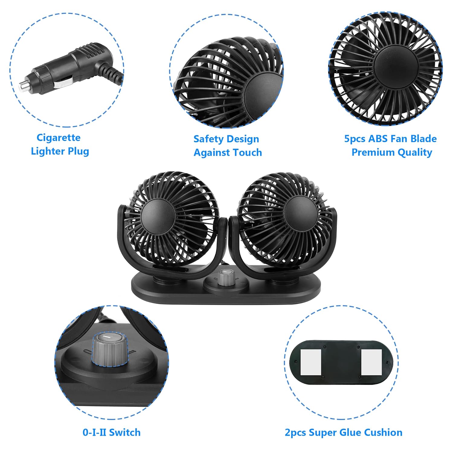 - ❄【Power Wind & Low Noise】Low energy consumption, low noise.blowing hot air out of parking car immediately with this 12 volt fan ,with 2 rotatable fan heads and 2 setting speeds,bringing power cool air for your family or pet in the rear seat.