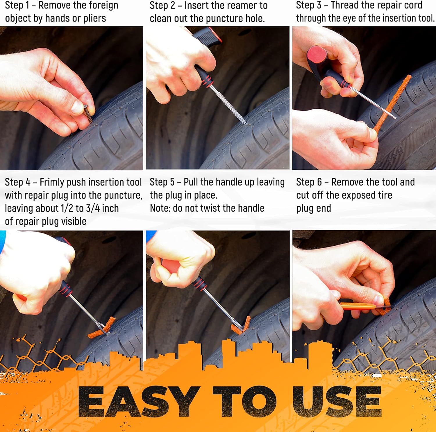 - Compact tire repair kit: Includes 2x more tire plugs; essential tools and supplies for fixing tubeless tires on cars, SUVs, motorcycles, enduro bikes, or lawnmowers
