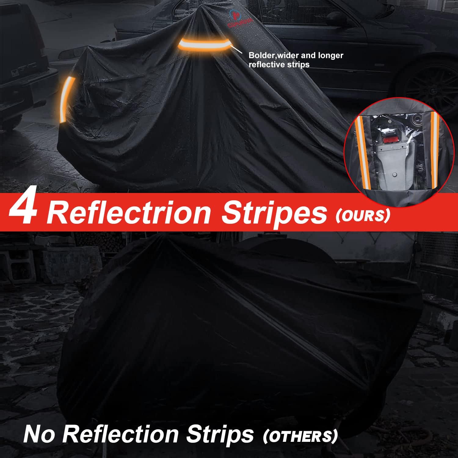 - ă4 NIGHT REFLECTIVE STRIPESă Comnova motorcycle cover comes with 4 reflection stripes. Two at the front and the other 2 at end sides. The bright color also decorates the motorcycle cover. The motorcycle cover also have transparent license plate design, it is easier to find your motorcycle in dark.