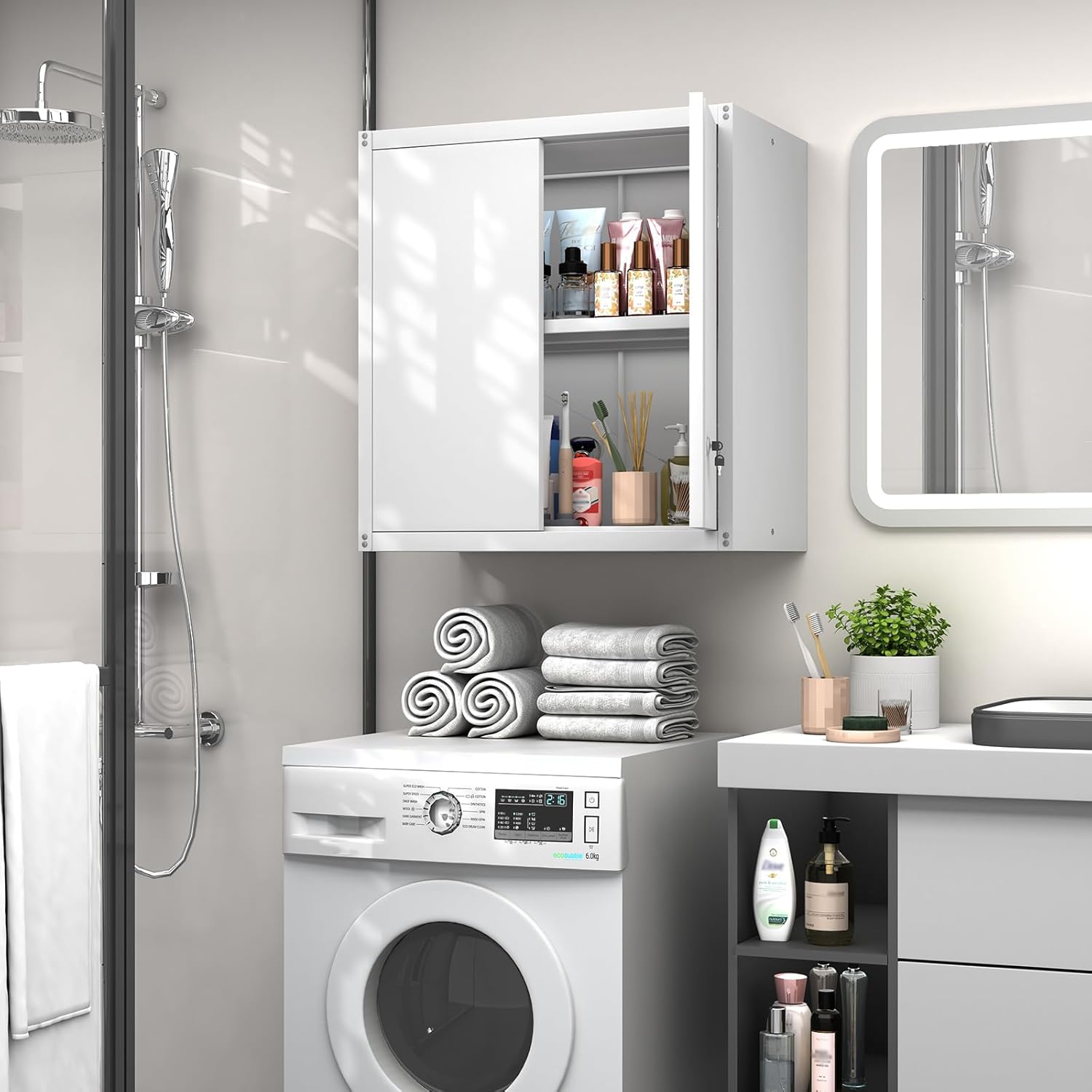 - ăKeep Your Space OrganizedăThis hanging cabinet has 2 locking doors, ensure your items safe and private, keep your space tidy and organized, and never need to worry your items accidental fall out from the cabinet