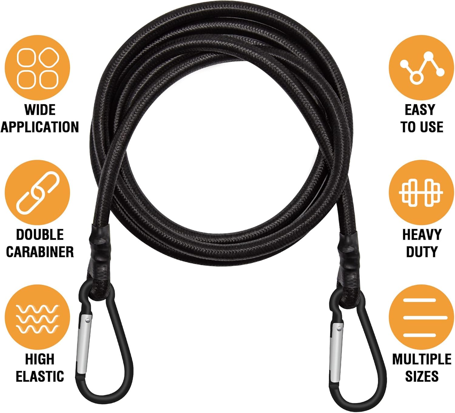 - Heavy Duty Bungee Cords with Carabiner: The elastic band is made of high quality durable rubber and fiber, wrapped with nylon yarn outside, heavy duty reinforced double braided rope ensures good load bearing and long service life. Heavy-duty steel hooks on both ends are vinyl coated to prevent rust.