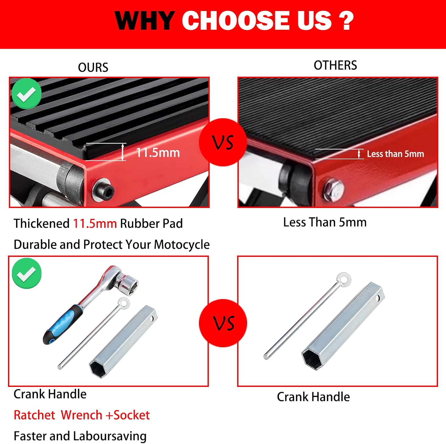 - Laboursaving : In addition to the crank handle,we also have an extra ratchet wrench,which is easier to use than crank handle,you will spend less effort to lift the motorcycle up quickly