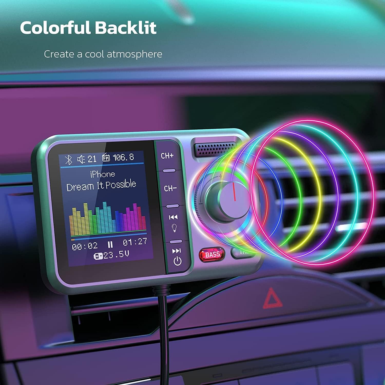 - 8 Colorful LED Backlit Modes: Long press the light button on the fm transmitter bluetooth for car to enter the light change mode, and then spin the knob to adjust to the light mode you want. There are 7 mono color modes plus 1 color-changing mode, choose any mode you like to decorate your space, let it color your car!