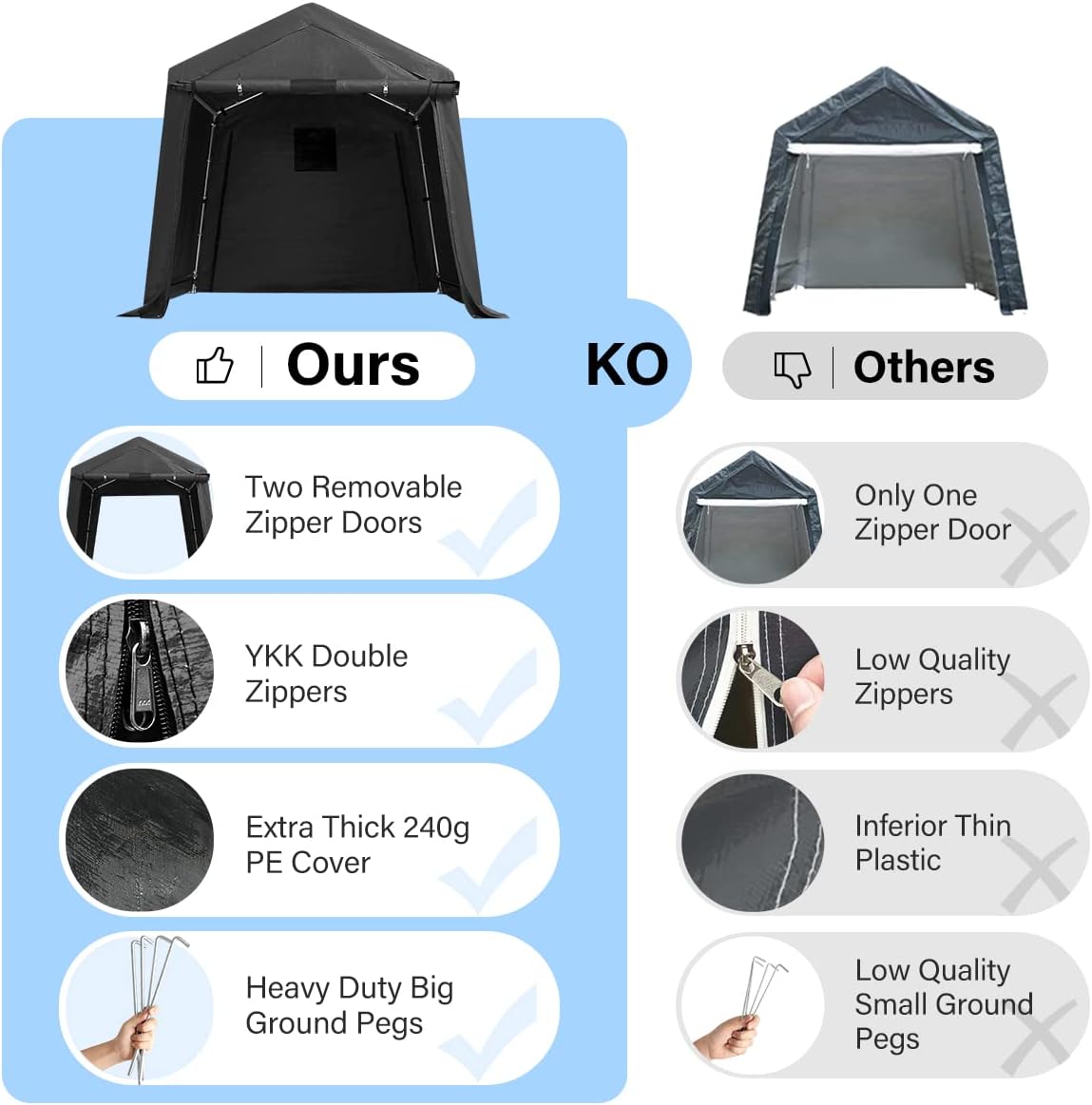 - 【Heavy Duty Durable Frame】✔1-1/2-inch diameter steel poles provide stability and strength to make the storage shelter carport safer. The garage storage tent is equipped with upgraded 0.32X11.81 inch (8X300mm) L-Type pegs, thickened and enlarged to increase stability.