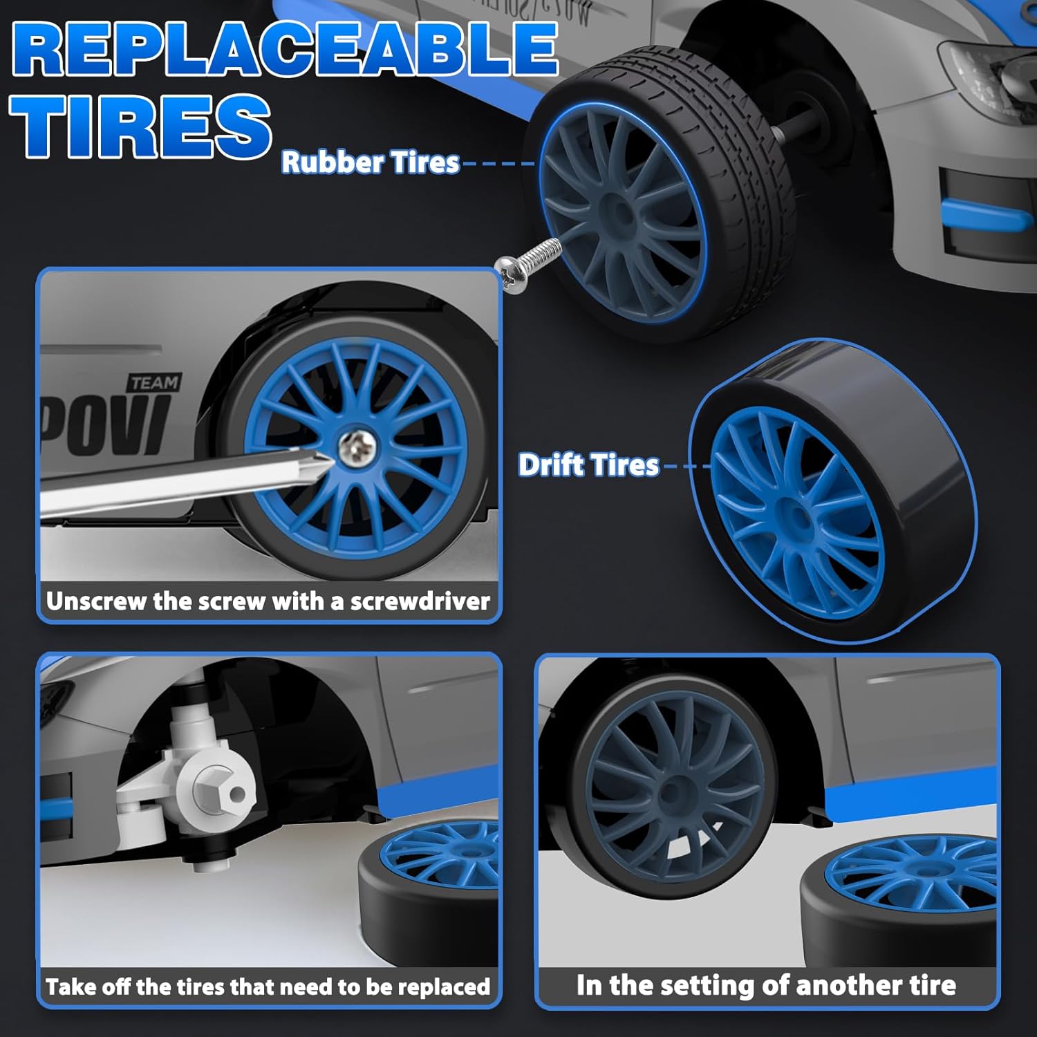 - Rechargeable Fast Car: Full function RC drift car with a rechargeable battery. Don't worry about being out of charge anymore. Forward, reverse, left/right turn, front LED lights, U-shaped drift, figure 8 drift, all-wheel drive