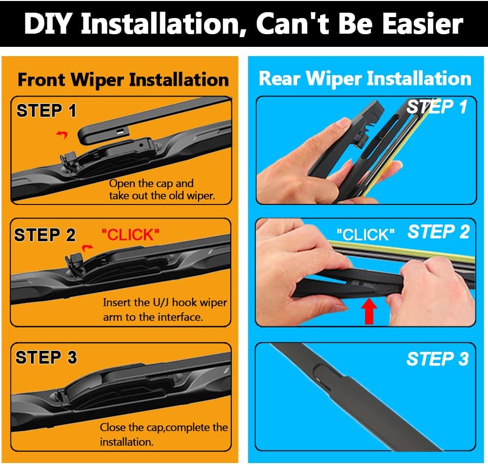 - WHAT YOU GET:Complete set of 3 wiper blade : (Left and right and Rear),โ SUPER CUSTOMER SERVICE โ AUTOBOO windshield wipers provide 24-hour online service, 6-month-returning freely.