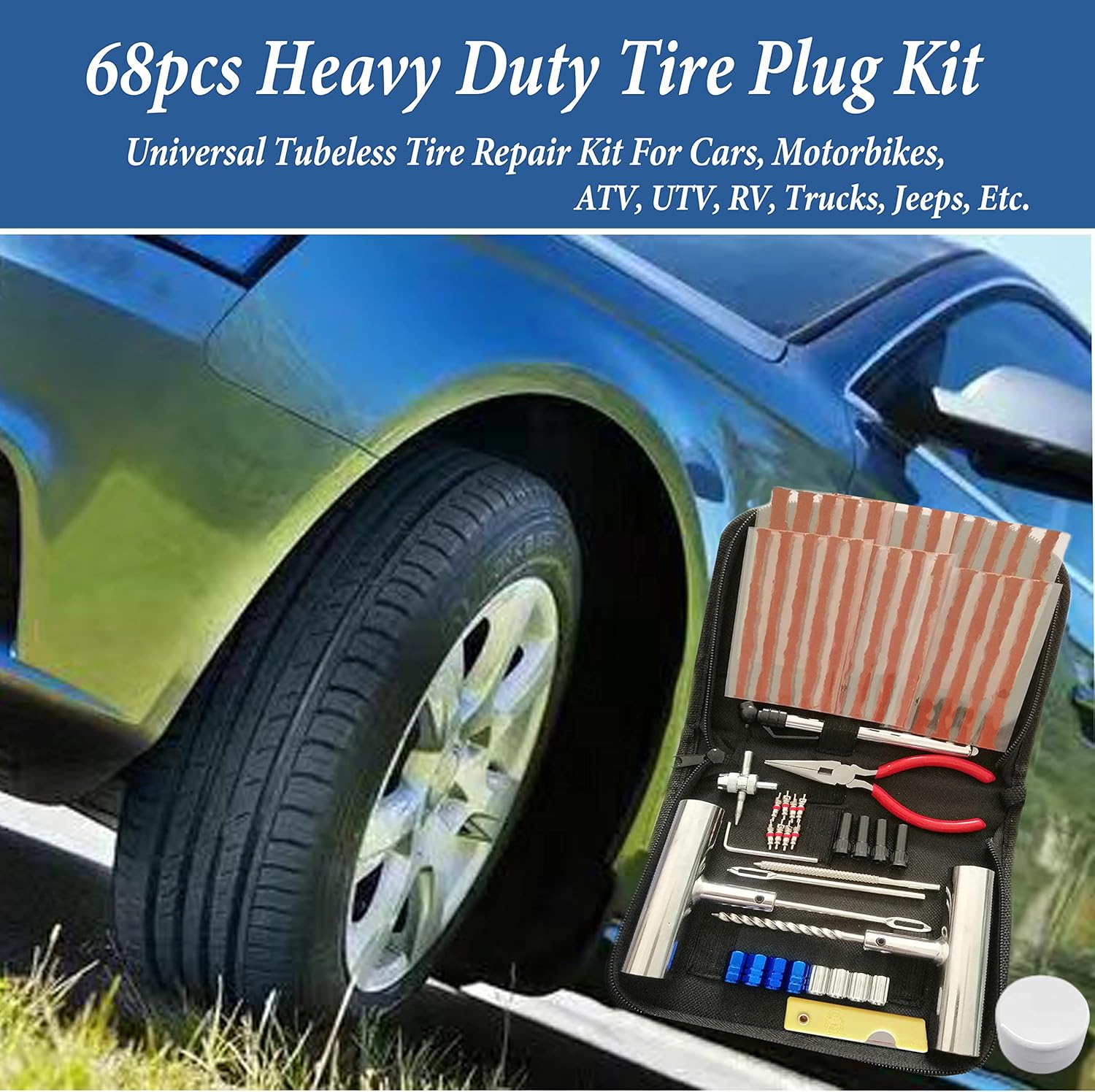 Tire Repair Kit, 68pcs Heavy Duty Tire Plug Kit, Universal Tire Repair Tools Flat Tire Puncture Repair for Car, Motorcycle, Truck, SUV, RV, ATV, Tractor, Trailer Fix Punctures and Plug Flats Patch Kit
