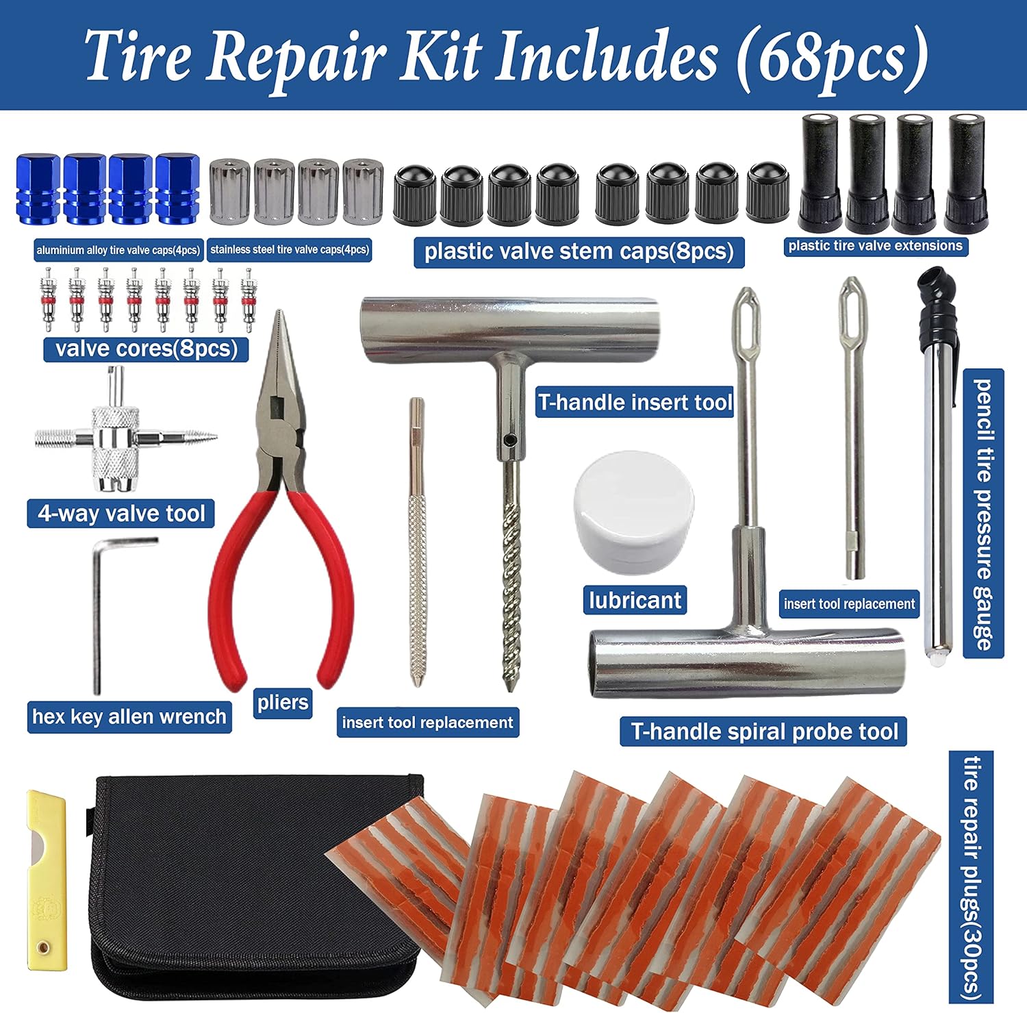 - Included Components : 30pcs tire repair plugs,pencil tire pressure gauge,T-handle spiral probe tool,T-handle insert tool,2pcs insert tool replacement,lubricant,pliers,hex key allen wrench,4-way valve tool,8pcs valve cores,plastic tire valve extensions,8pcs plastic valve stem caps,4pcs aluminium alloy tire valve caps ,4pcs stainless steel tire valve caps,knife,organizer bag 30pcs tire repair plugs,pencil tire pressure gauge,T-handle spiral probe tool,T-handle insert tool,2pcs insert tool replacement,lubricant,pliers,hex key allen wrench,4-way valve tool,8pcs valve cores,plastic tire valve extensions,β¦ See more