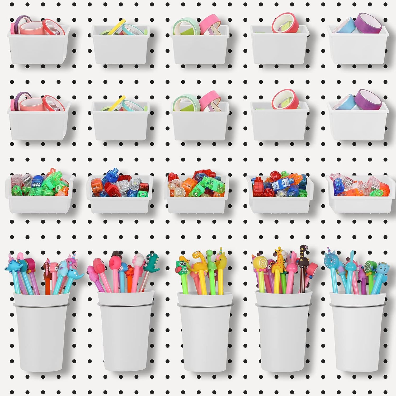 - Diverse Heavy Duty Size: you will receive 5 pieces of pegboard cups in 3.35 - 2.36(D) x 4.72(H) inches,15 pieces of peg board bins in different sizes, namely 3.54 x 3.15 x 1.77 inches (L x W x H), 3.94 x 3.94 x 1.97 inches (L x W x H), coupled with metal cup hooks in 3.35 inches and 2 inches loop pegboard, the diverse size and enough quantity to meet your various needs; Note: the pegboard is not included