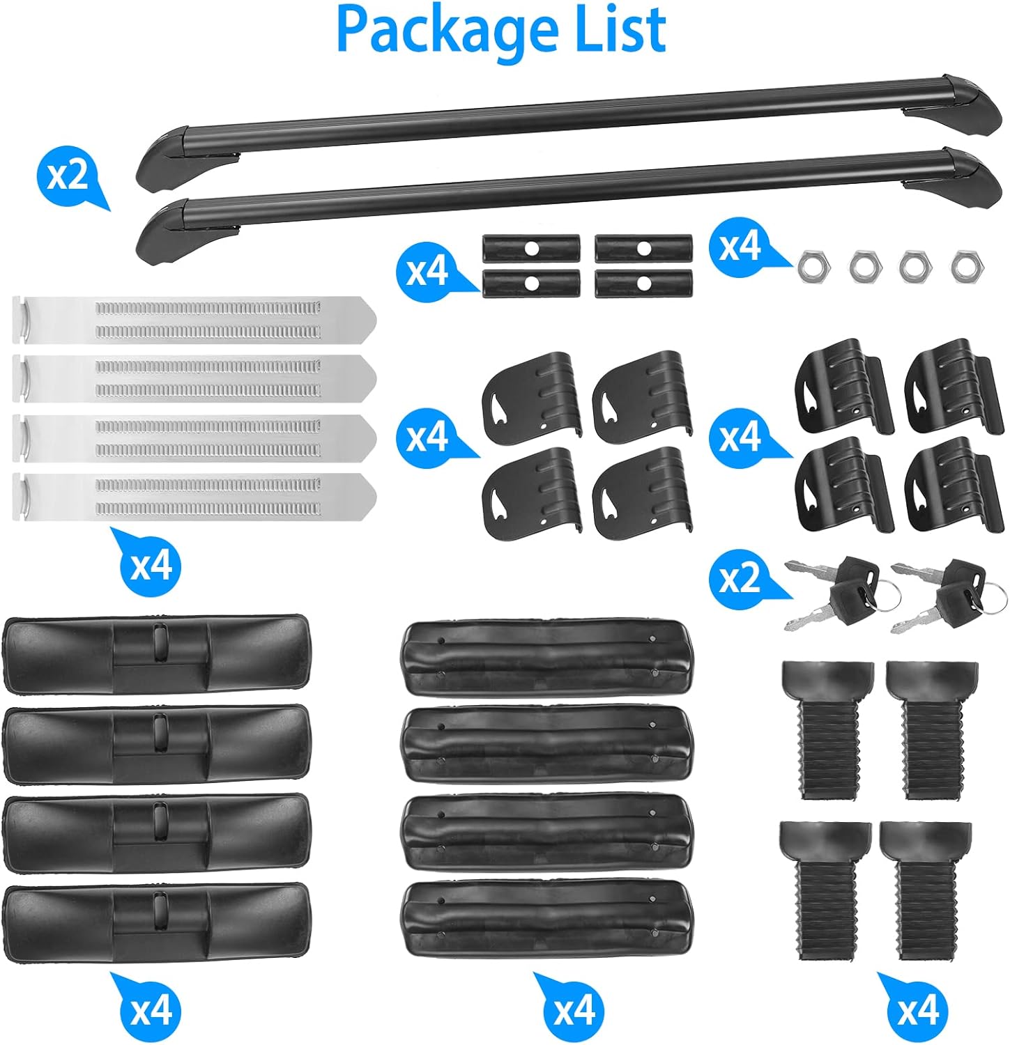 - ăFit For Most Bare RoofăUniversal fit most vehicles with car no side rails roof. It can be easily mounted on most vehicles which the distance between the rain grooves is between 42.91in-44.88in to carry bike, kayak racks, cargo frame, cargo boxes, snowboard, surfboard, etc. The roof rack is the foundation of the roof equipment. You can choose different roof rack accessories depending on the equipment.Pls make sure our roof rack cross bars for your car before you purchase.thank you