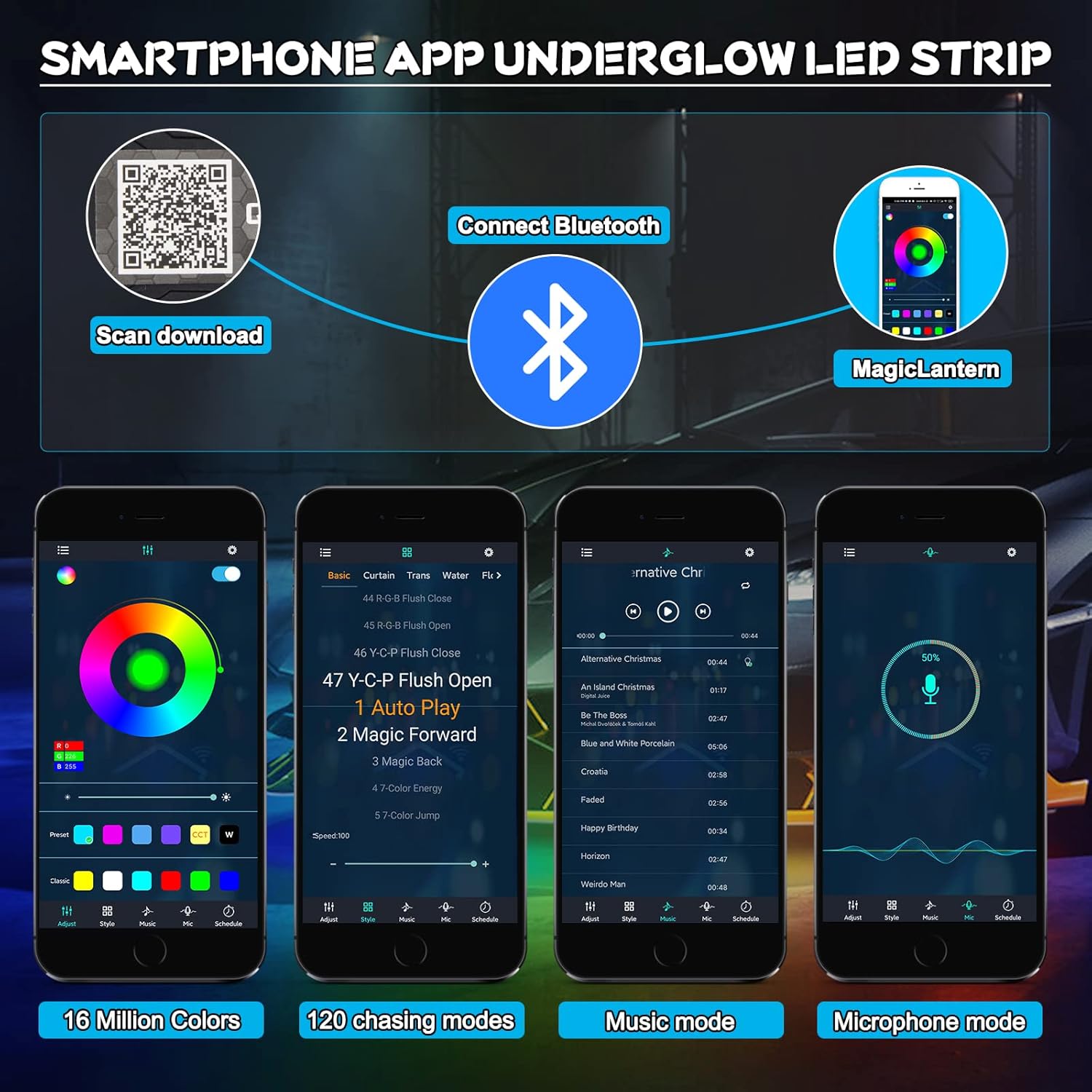 - APP Control Chasing Color Underglow Lights : For this underglow led light strip, you can download APP in Google play or APP store, connect Bluetooth, no setting or network management required. Easily turn on/off, adjust color and brightness. Everything controlled by your Smartphone, Very convenient and easy operation. NOTE: APP named: MagicLantern. Supports IOS 10.0 or above / Android 4.4 or above.