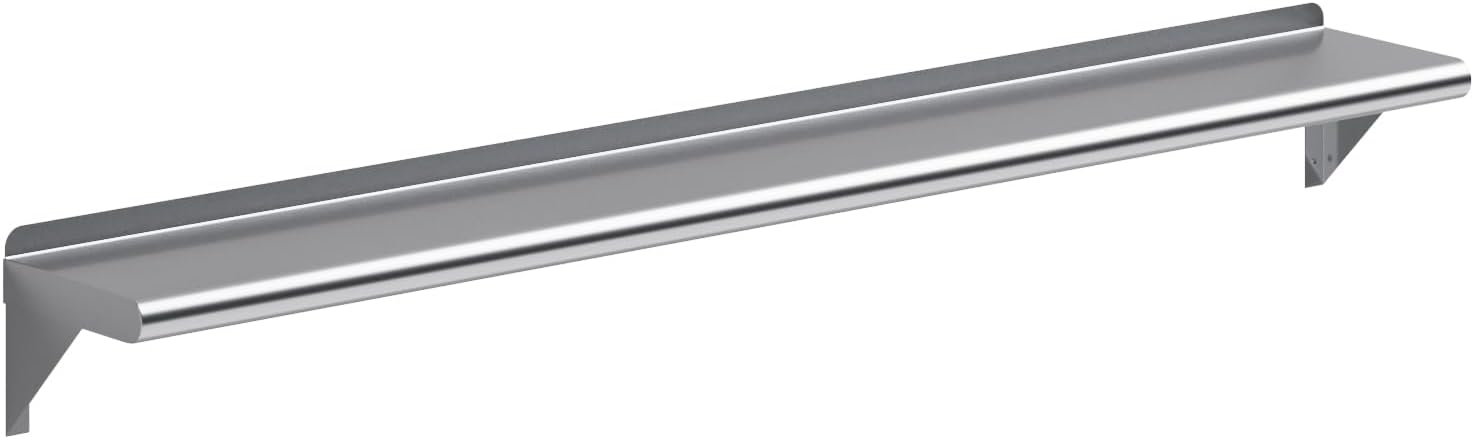 - 8 in. x 60 in. Stainless Steel Wall Shelf with 6 in. High Mounting Brackets. This heavy-duty multifunctional stainless wall shelf is made with 18 gauge stainless steel and can hold up to 205 Lbs of weight. The design features a 1 in. backsplash and bullnose edge. It's made with durable welded corners and support brackets.