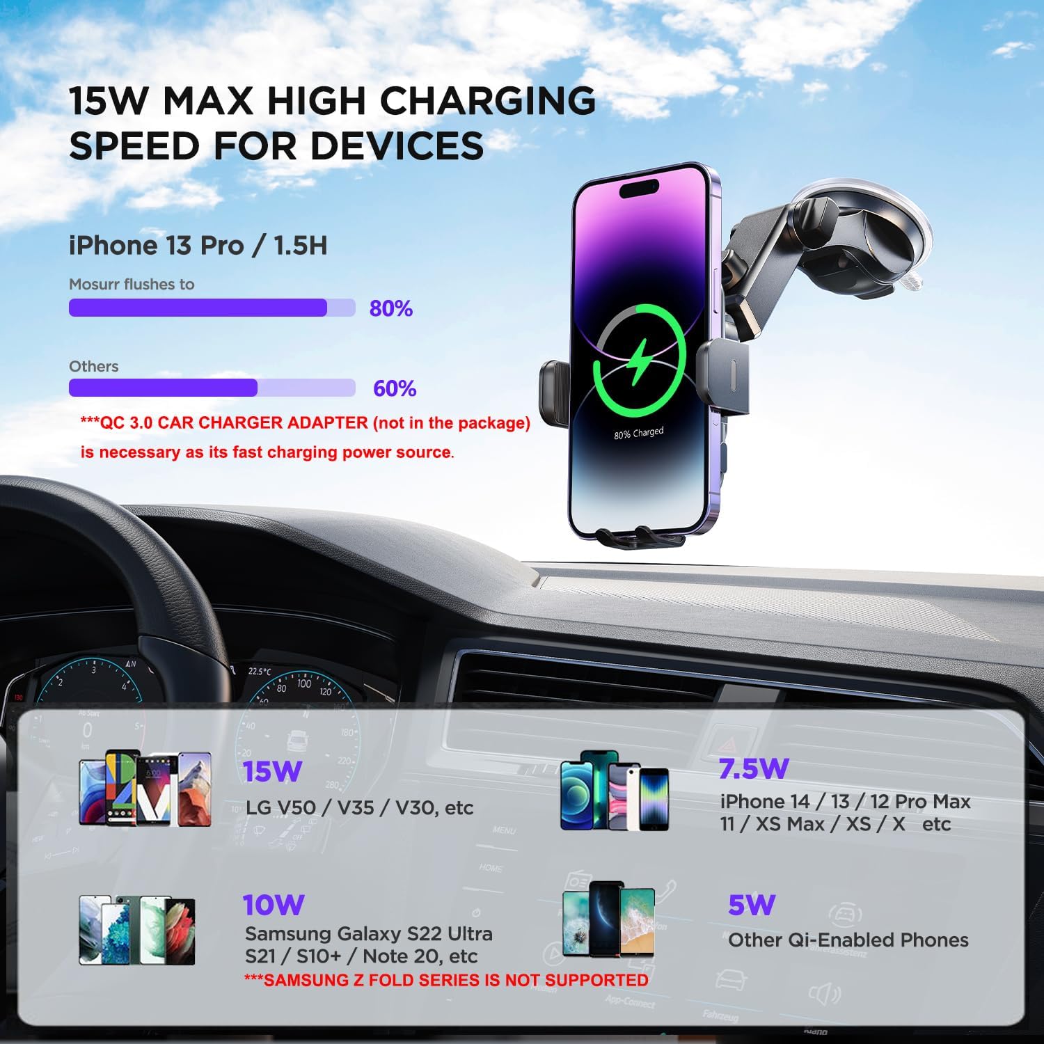 - 15W QI FAST WIRELESS CAR CHARGER: Wireless car charger mount charges your Qi-enabled smartphone on the go and optimizes the power output delivery. It offers 15W Max Charging Speed for LG V50/V40/V30+, 10W Charging Speed for Samsung Galaxy S24 Ultra / S23 / S22 / S21+ / S20 / Note 10+, 7.5W Charging Speed for iPhone 16/15/14/13/12 Pro Max/11 / XS Max/XS, 5W for Other Qi-Enabled Phones. ***For 15W 10W, 7.5W FAST CHARGING MODE, QC 3.0 CAR CHARGER ADAPTER (not in the package) is Necessary as its power source. Includes 1 USB-C charging cable, and only 1 port provides power and can only charge one device at a time