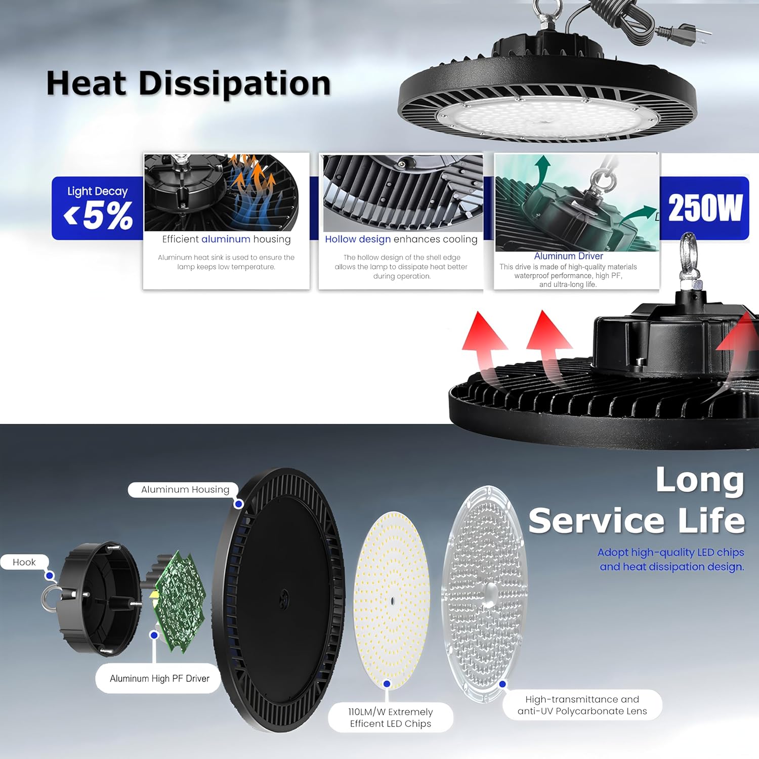 - ✔️【Led High bay Light 250W details】It features LED technology top quality diodes that total 30000 lumens,CRI80+,250W, 6000K daylight for your garage, warehouse,providing the best indoor lighting experience.