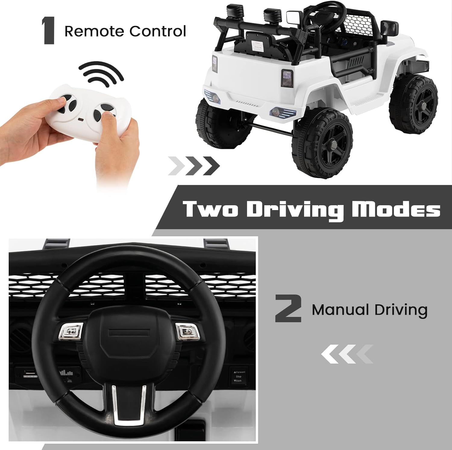 - Two Driving Mode: This jeep for kids can be operated not only by children through the foot pedal, but also manually by parents using the 2.4GHz remote