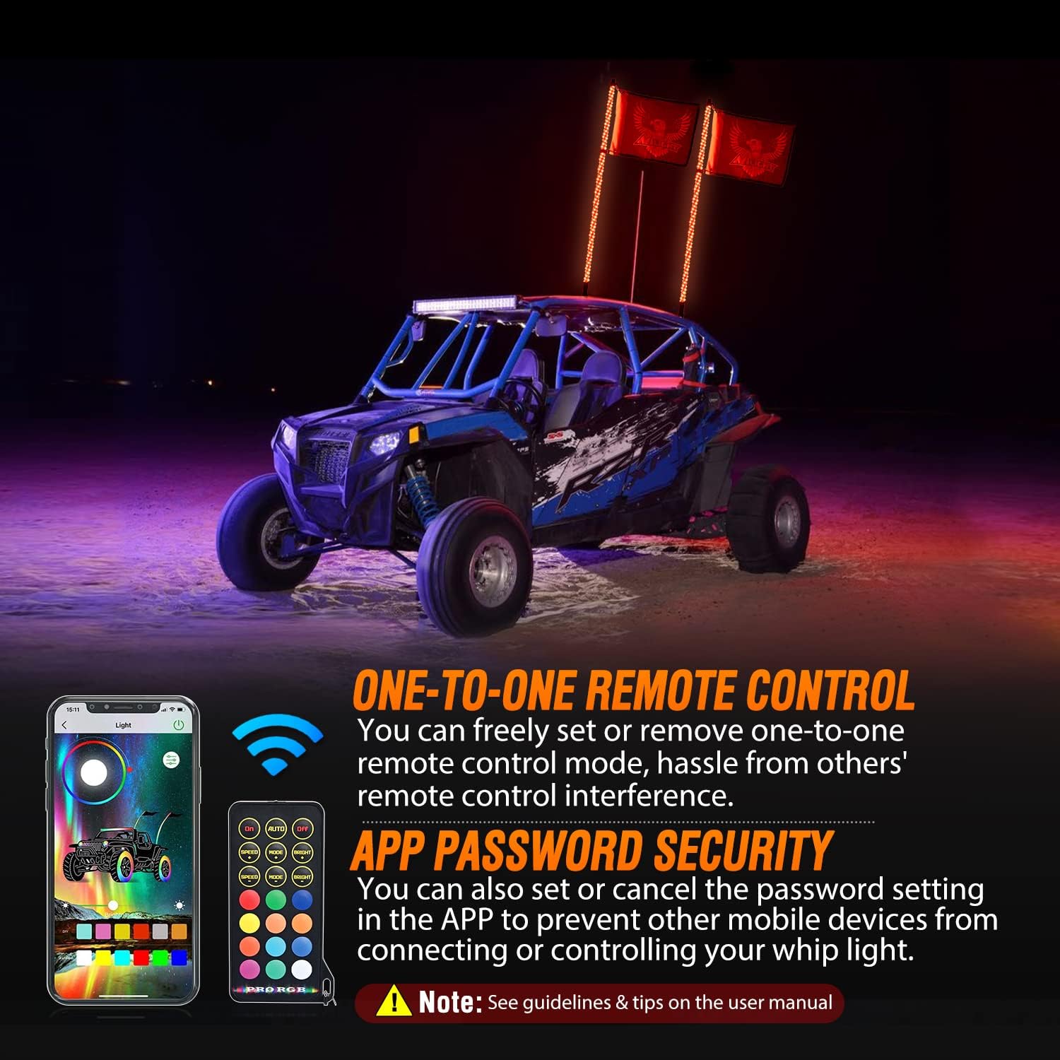 - ăAPP & Remote ControlăDual control by Bluetooth APP and RF remote with a hook, no more worries about losing the remote. And you own more superpowers to control this magical whips, including grouping with friends' devices, countless RGB colors & editable chasing modes options, amazing syn-with music modes and being able to adjust color brightness/speed/colors.