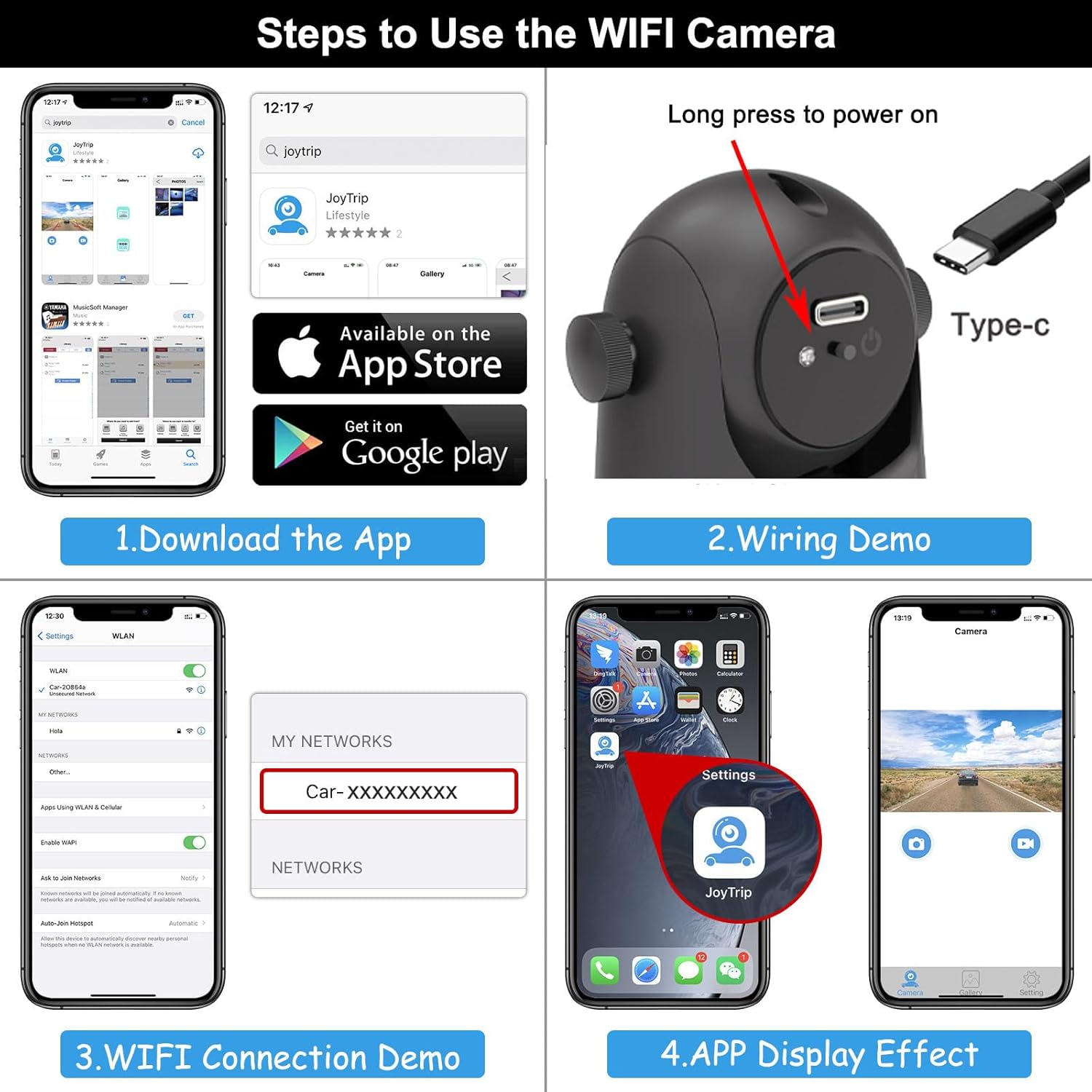 - ăRechargeable BatteryăBuilt-in 1600mAh rechargeable battery, the magnetic WiFi reversing camera can be charged by USB charging cable(type-c) without replacing the battery. When fully charged, it could continuously work for up to 4~7H. With power led display, you can clearly know the power status of the camera and charge it in time.Its fully charging time is 3 hours